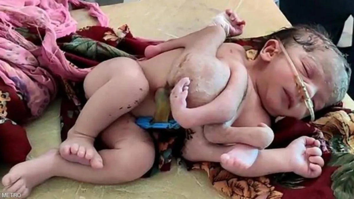 وقال الطاقم الطبي إن الطفلة الأنثى ولدت مع مجموعة إضافية من ساقين ويدين تغطي كامل صدرها وبطنها.