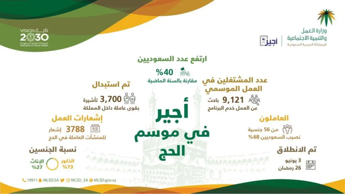 أعلنت وزارة العمل والتنمية الاجتماعية عن إحصائيات برنامج أجير، الذي يعنى بتنظيم العمل في موسم الحج وتسهيل التفتيش عن طريق توحيد الجهود لإصدار تصاريح العمل الإلكترونية من خلال بوابة تجمع بين المنشآت العاملة والأفراد الراغبين بالعمل في موسم الحج.