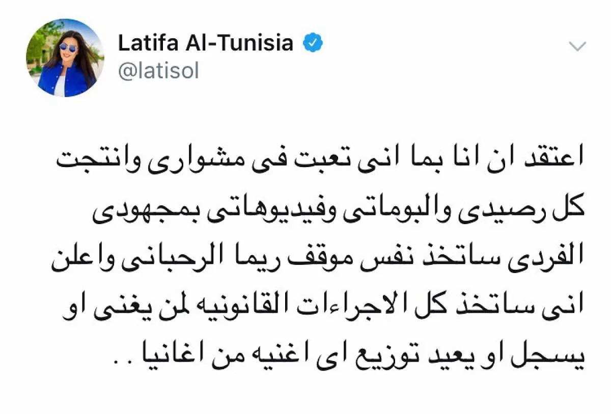 ونشرت لطيفة عبر حسابها على موقع تويتر رسالة واضحة قالت فيها: اعتقد ان انا بما انى تعبت في مشواري وانتجت كل رصيدي وألبوماتي وفيديوهاتى بمجهودي الفردي سأتخذ نفس موقف ريما الرحباني وأعلن انى سأتخذ كل الاجراءات القانونية لمن يغنى او يسجل او يعيد توزيع أي اغنيه من اغانيا.