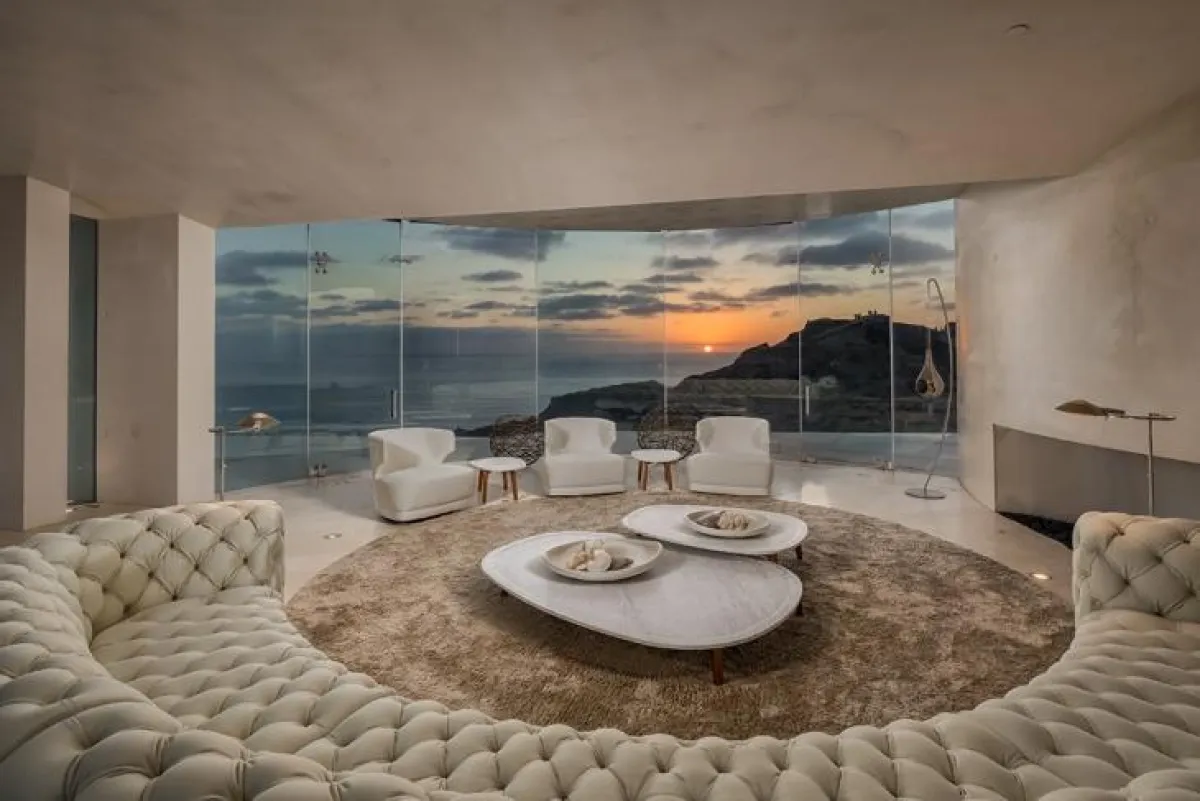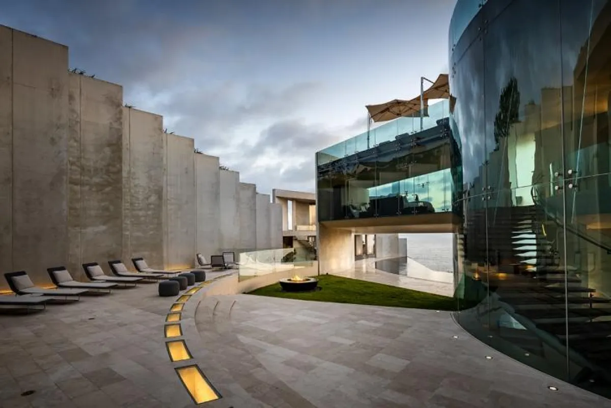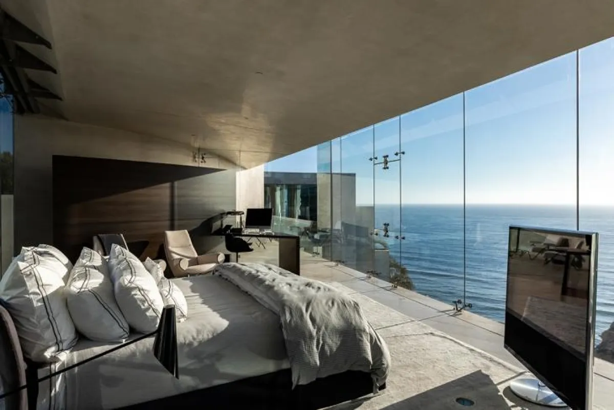 يحظى العقار بإطلالات بانوراميَّة على المحيط الهادئ، وهو مُشيَّد من الخرسانة المصقولة البيضاء، والدعائم الفولاذ، والجدران الزجاج الممتدة من الأرض إلى السقف، ومُجهَّز بنظام حديث.