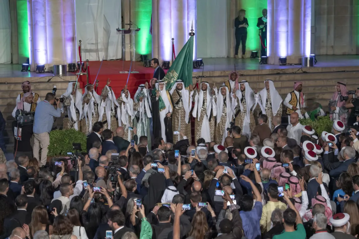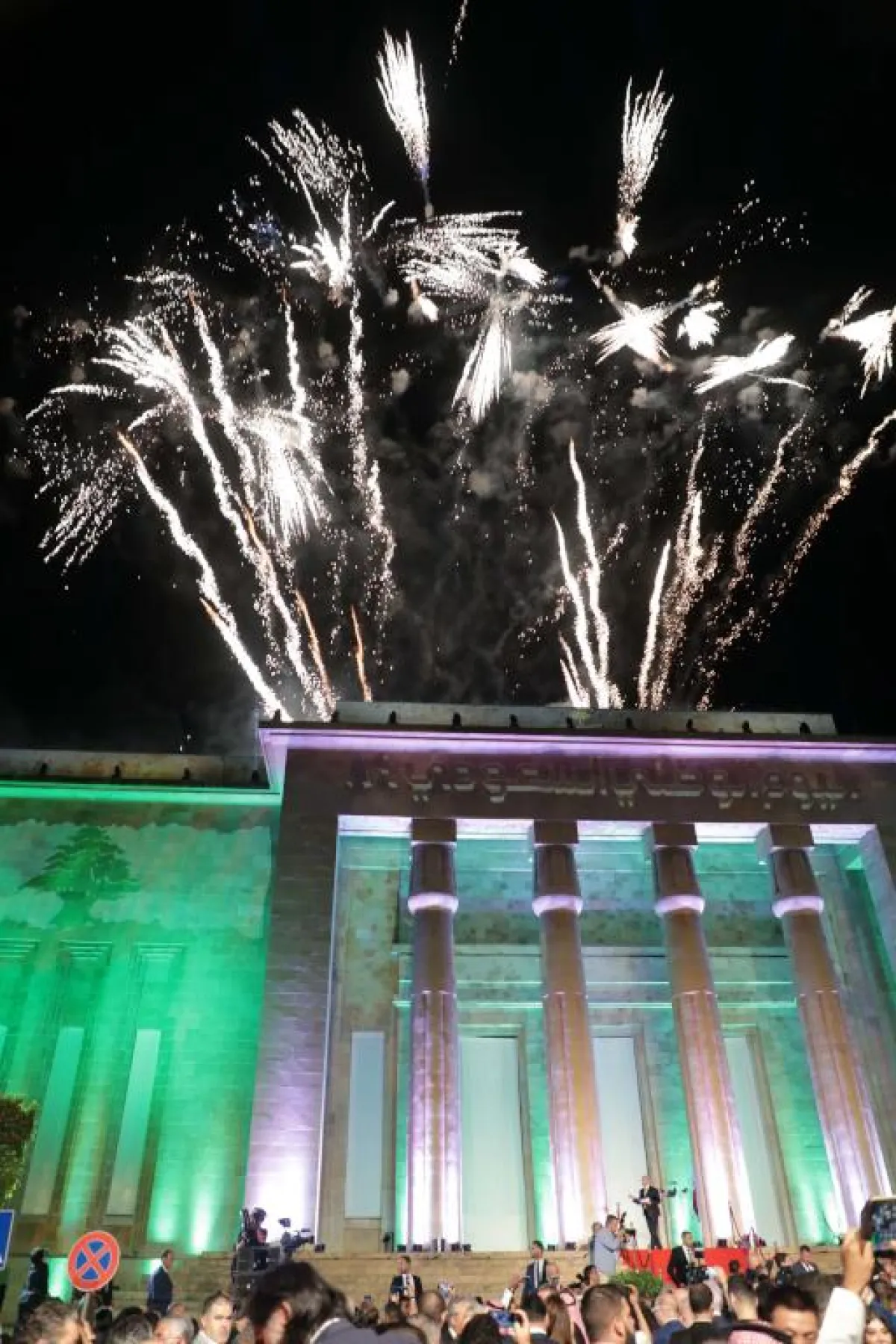 وفي ختام الحفل ألقى الشاعر طلال حيدر قصيدة بالمناسبة، وأضاءت الألعاب النارية سماء العاصمة اللبنانية احتفاءً بالمناسبة، على وقع رقصة العرضة السعودية .