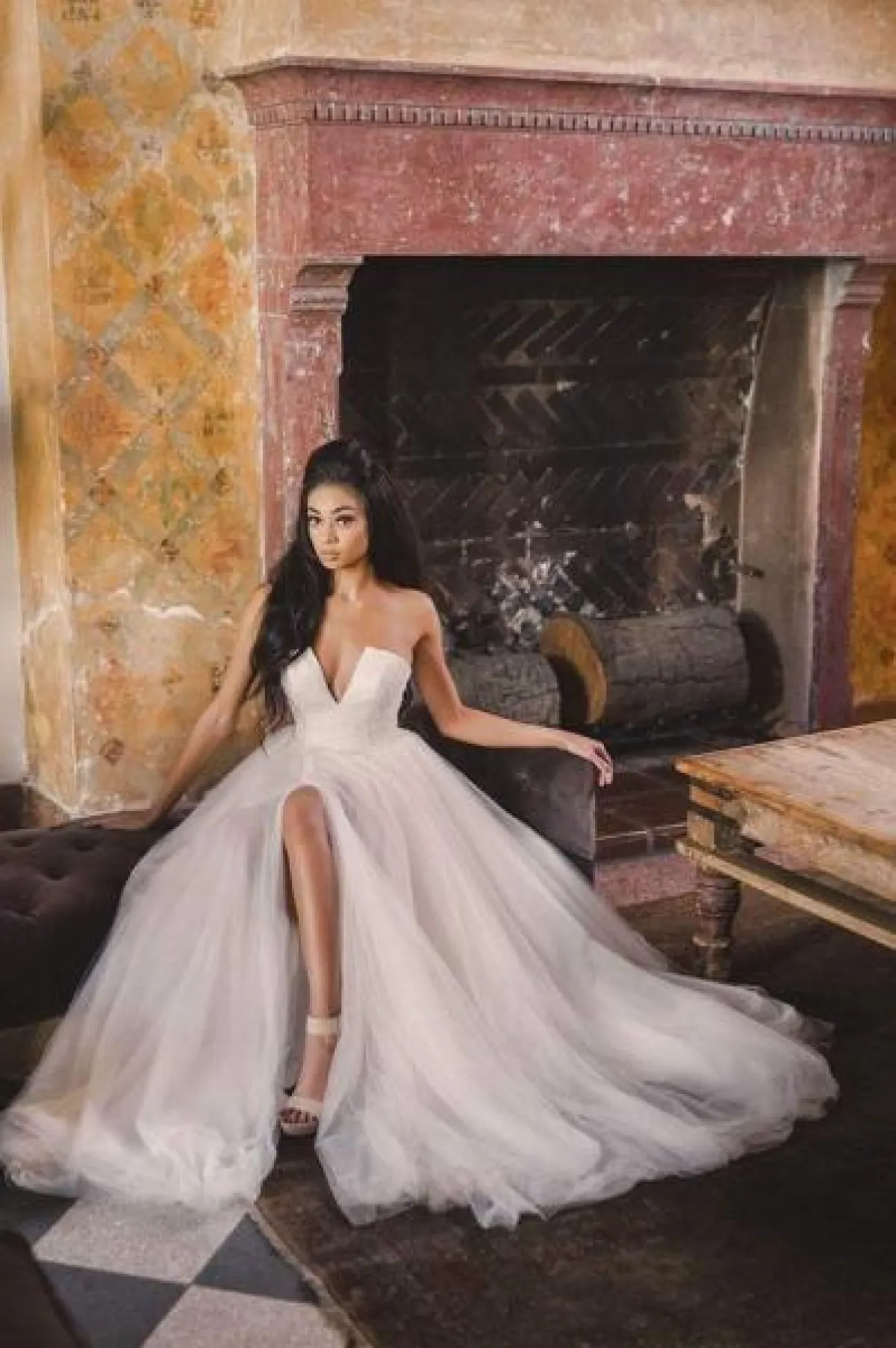 أيضاً يمكن للعروس التي تملك ساق مثالية أن تختار فستان زفاف بشق أمامي طويل يمنحها إطلالة أنثوية ساحرة، مثل فستان الزفاف المنفوش من Adam Zohar.