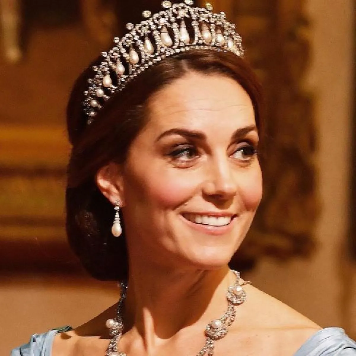تألقت كيت ميدلتون في يوم العرس بتاج فخم مرصع بالألماس، مع الطرحة التول الطويلة.