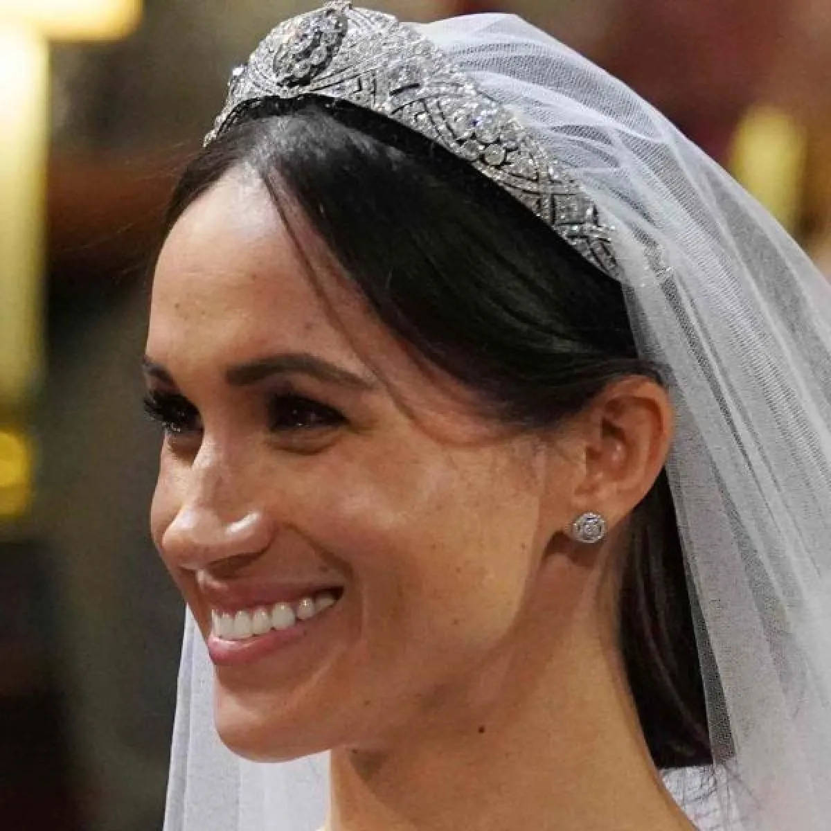 اعتمدت ميغان ماركل تاج فخم ومرصع بفصوص الألماس البرّاقة في يوم عرسها، ونسقته مع طرحة تول طويل.