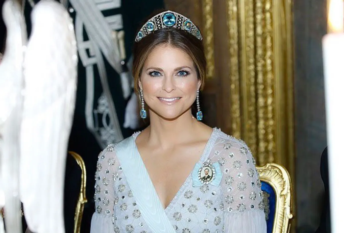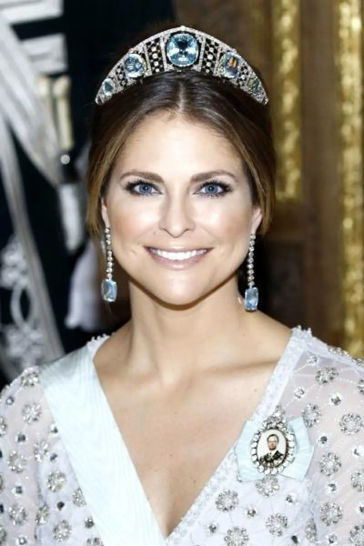حيث اختارت تاج مرصع بالألماس والياقوت الأزرق مع أقراط طويلة مرصعة بنفس الأحجار.