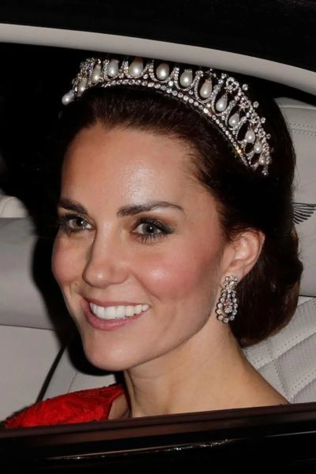 كذلك ظهرت بتاج الأميرة ديانا الماسي والمرصع باللؤلؤ في مناسبات مختلفة، ونسقت معه أقراط ماسية فخمة.