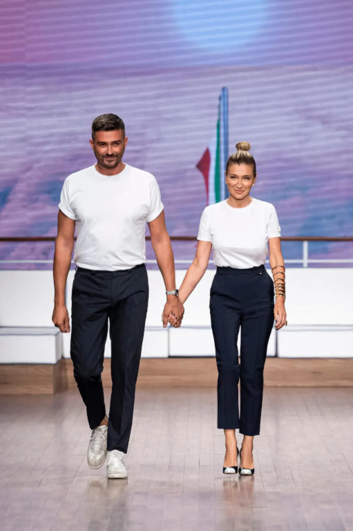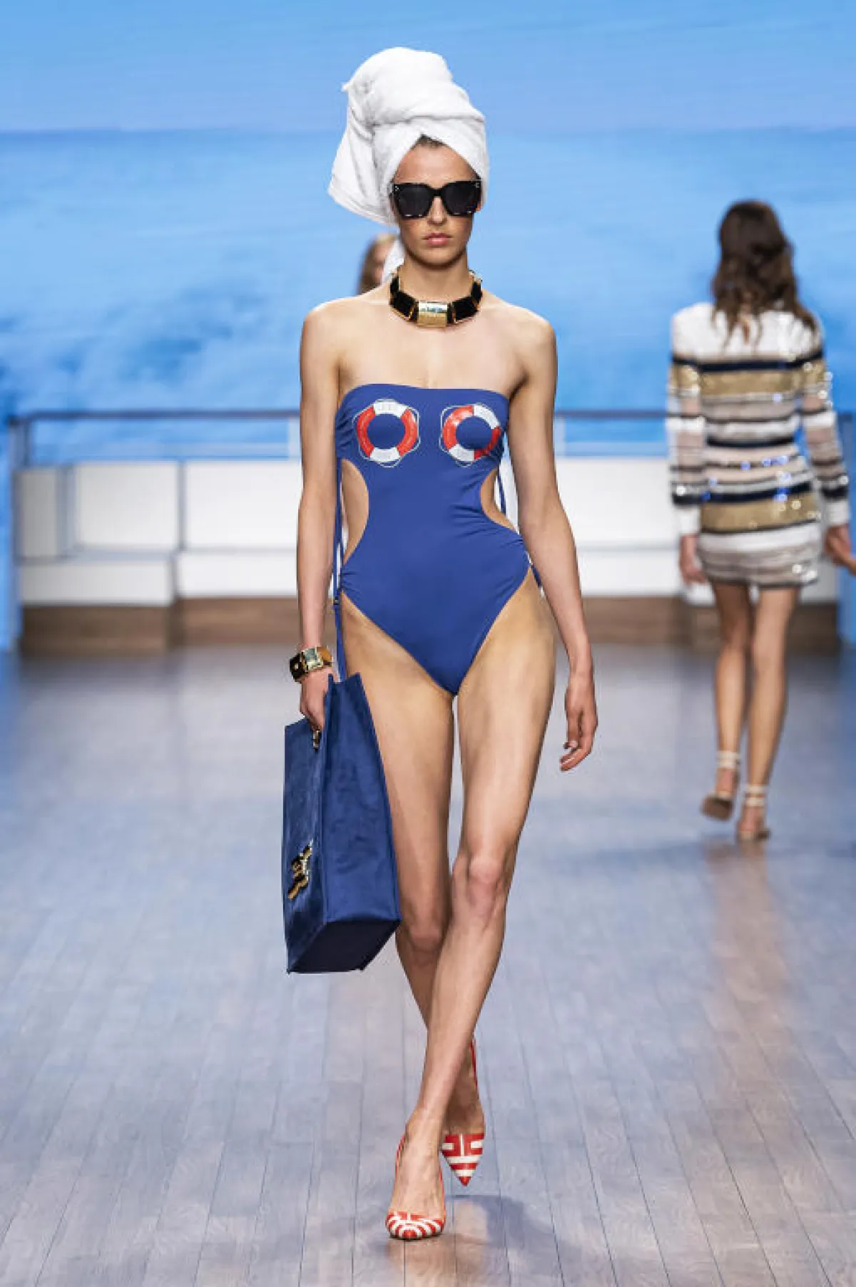 تستلهم سترات البليزر روح الزي الرسمي للبحّارة؛ فيما تُذكّرنا الأقمشة المرفرفة بنضارة الصيف في تشكيلة تستدعي إلى الأذهان ألوان البحر وعناصره. اللون الأزرق بدرجاته، من الكوبالت المثير إلى التيفاني والظلال الرمزية للعلامة التجارية؛ والتي تتناوب مع لمسات جديدة من الألوان مثل النعناع. تُزيّن الملابس بسلاسل من المجوهرات والمراسي والأسلاك المضفرة التي تعطي شكلاً متوازناً ورائعاً للكتفين يليق بالسير على السجادة الحمراء، ثم تتقاطع مع الأحجار الكريمة التي تلائم امرأة التي لا تستطيع تخيل الحياة دون ألق؛ وبعد ذلك تهبط على الشاطئ بطرازات تحتضن الجسم والتي تعكس الحركة الخفية للأمواج وانعكاسات الشمس المتلألئة. وتُعد الاكسسوارات مُكمّلات أساسية تجعل كل لحظة من الرحلة كنزاً ثميناً: القبعات واسعة الحواف، وأربطة الشعر المصنوعة من القش الفخم وحقائب اليد المصنوعة من ليف نخل الرافية والتي تفسح المجال أمام الأساور والسلاسل الذهبية التي تحمل سحرًا مستوحى من البحر. ويتناقض الكعب العالي مع الصنادل المسطحة تماماً، على نحوٍ من شأنه تأكيد النمط الحاسم للأيقونة "اليزابيتا فرانكي"، والتي لا تتخلى أبداً عن الإثارة التي تُميزها.