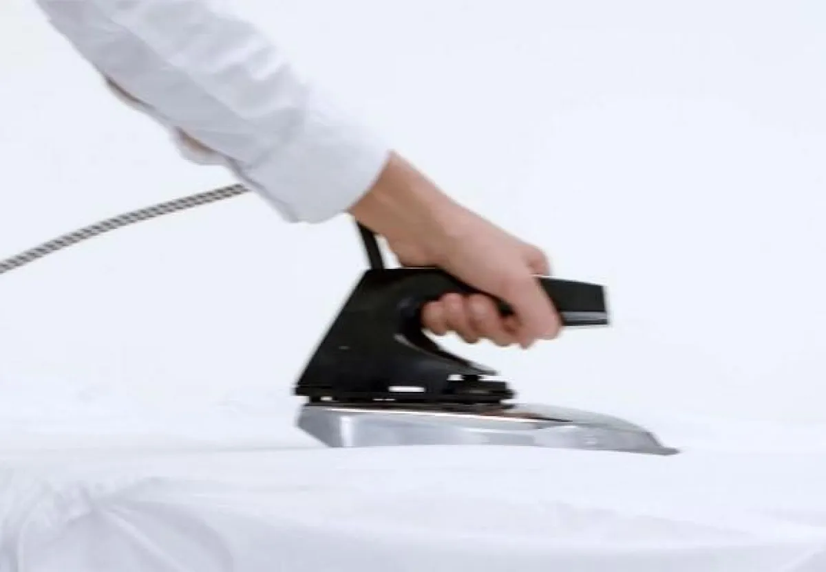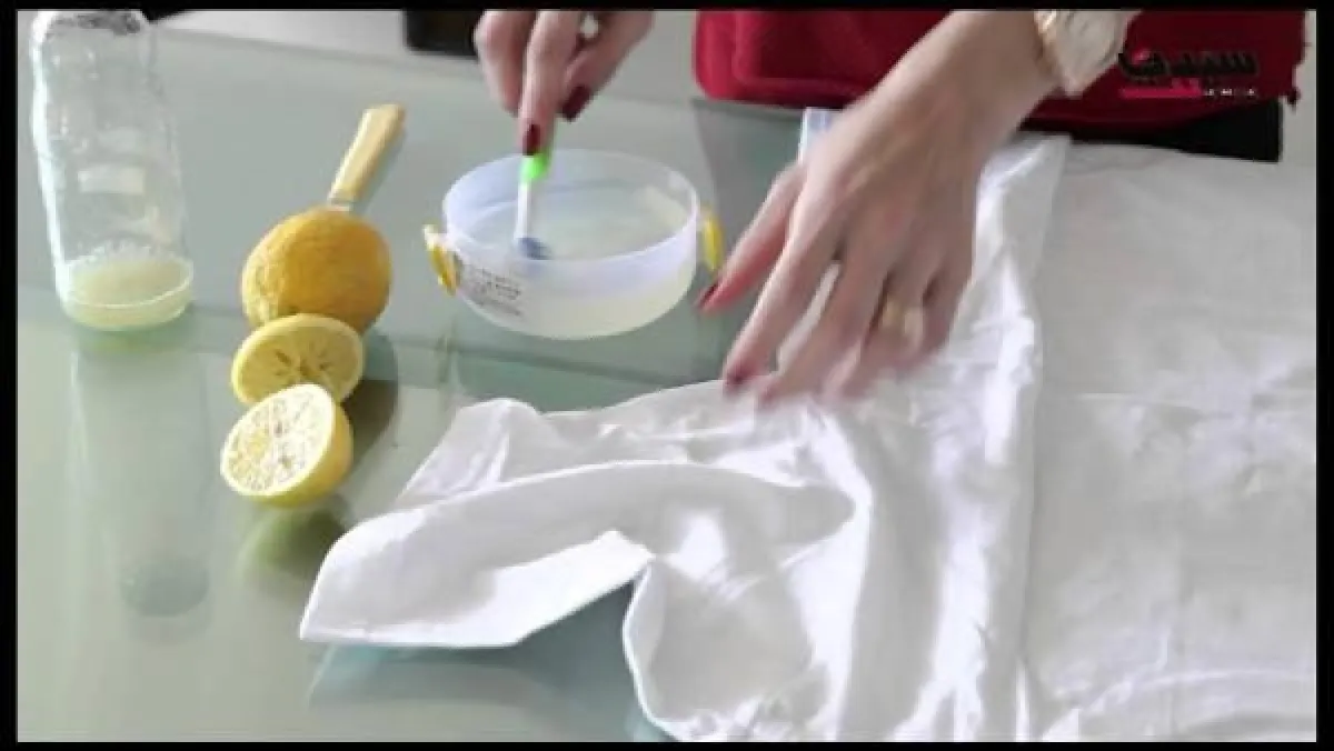 1. تقطَّع ثمرة الليمون الحامض إلى شرائح دائريَّة، فتسخن المكواة. توضع شريحة الليمون تحت القماش، ويكوى القماش من الخارج. ويجب تبديل قطعة الليمون من فترة لأخرى.