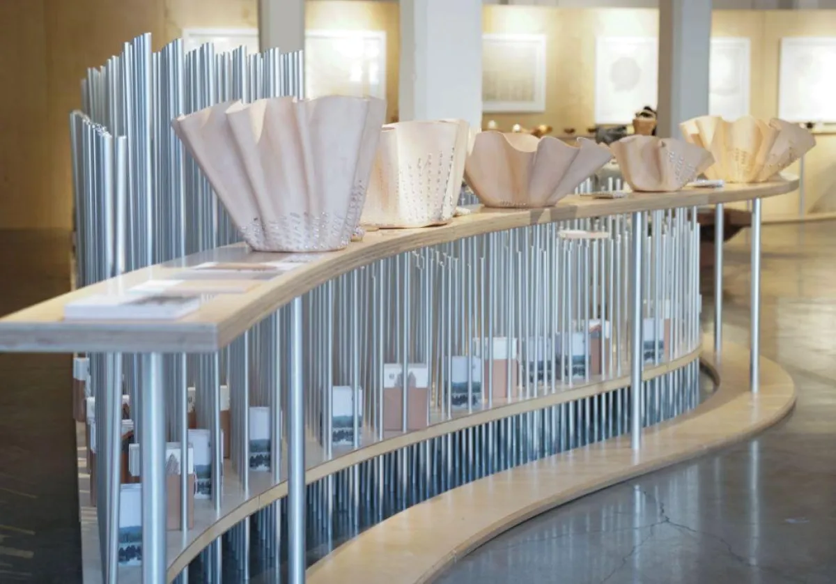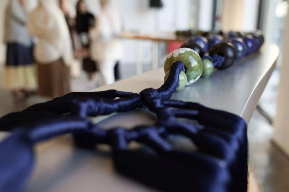 وترتكز مجموعة الأواني التي يقدمها المصمم الإسباني أدريان سلفادور كانديلا والمصممة الإماراتية شيخة بن ظاهر، على الميزات الطبيعية للجلد، إذ يمكن التحكّم بالجلد بسهولة ومرونة عند تبليله بالماء. وتمزج هذه الأواني الجلد الطبيعي ومنسوجات التلّي لتعرض حواراً بين حرفتين وثقافتين.
