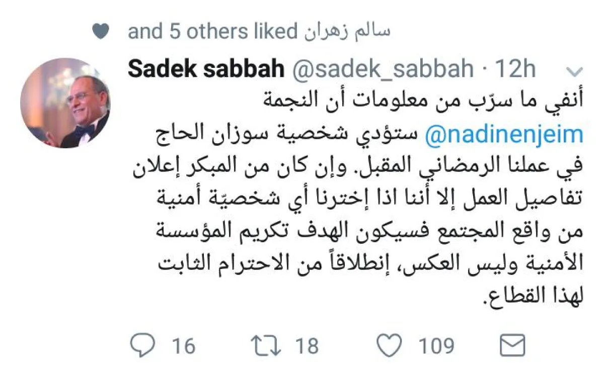 نفى المنتج صادق الصباح المعلومات التي أشارت إلى أنّ نادين نجيم سوف تؤدي دور الضابط السابقة في قوى الأمن الداخلي سوزان الحاج في عملها الرمضاني المقبل.