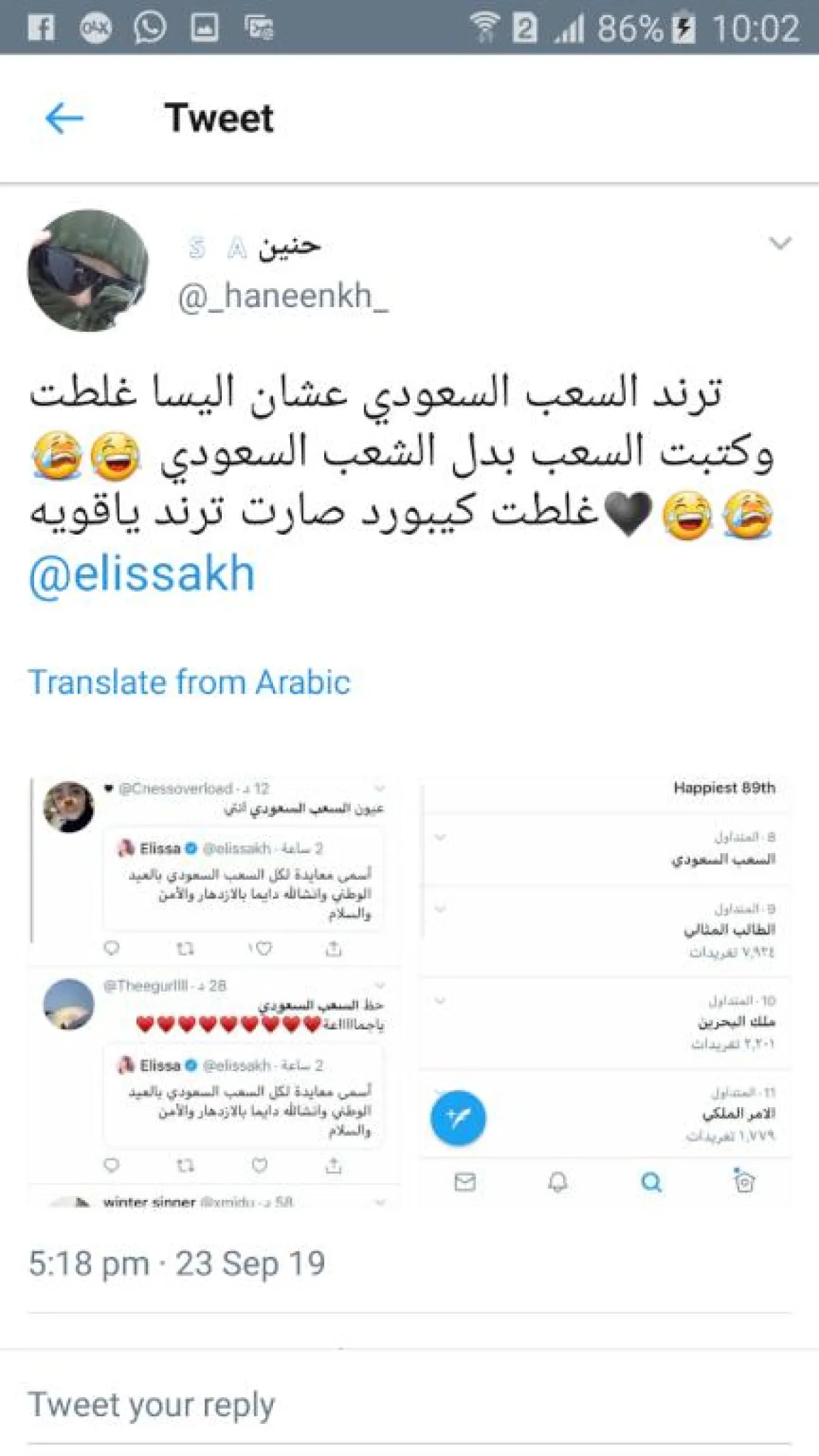 اليسا استبدلت سهوا، حرف "ش" بحرف "س" عندما كتبت في تغريدتها "أسمى معايدة لكل السعب السعودي بالعيد الوطني وانشاالله دايماً بالإزدهار والأمان والسلام".
