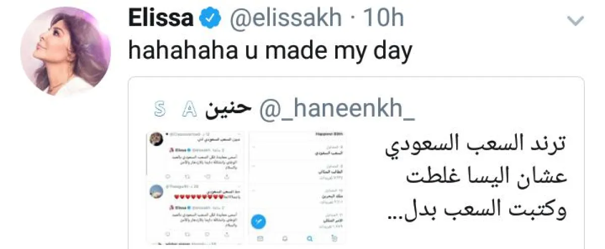 تصدرت إليسا بالأمس الترند على "تويتر" في السعودية بسبب تغريدة خاطئة إملائياً، كانت قد نشرتها لتهنئة الشعب السعودي بمناسبة العيد الوطني.