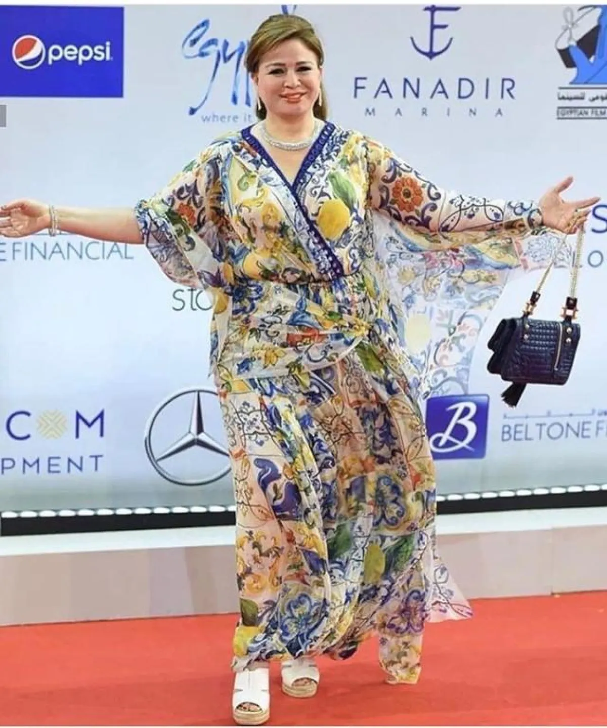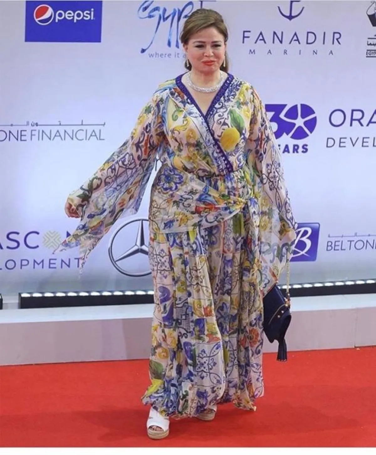 اختارت النجمة إلهام شاهين فستانًا برسومات الورود ملونًا بخامة الشيفون، جاء غير متناسق مع شكل جسمها، وقد علق البعض أنها بدت بوزن زائد بهذا اللوك، بخاصة عندما اختارت سليبر بكعب عالٍ خوص مفتوحًا من الأمام، لتبدو متكلفة أكثر في مظهرها.