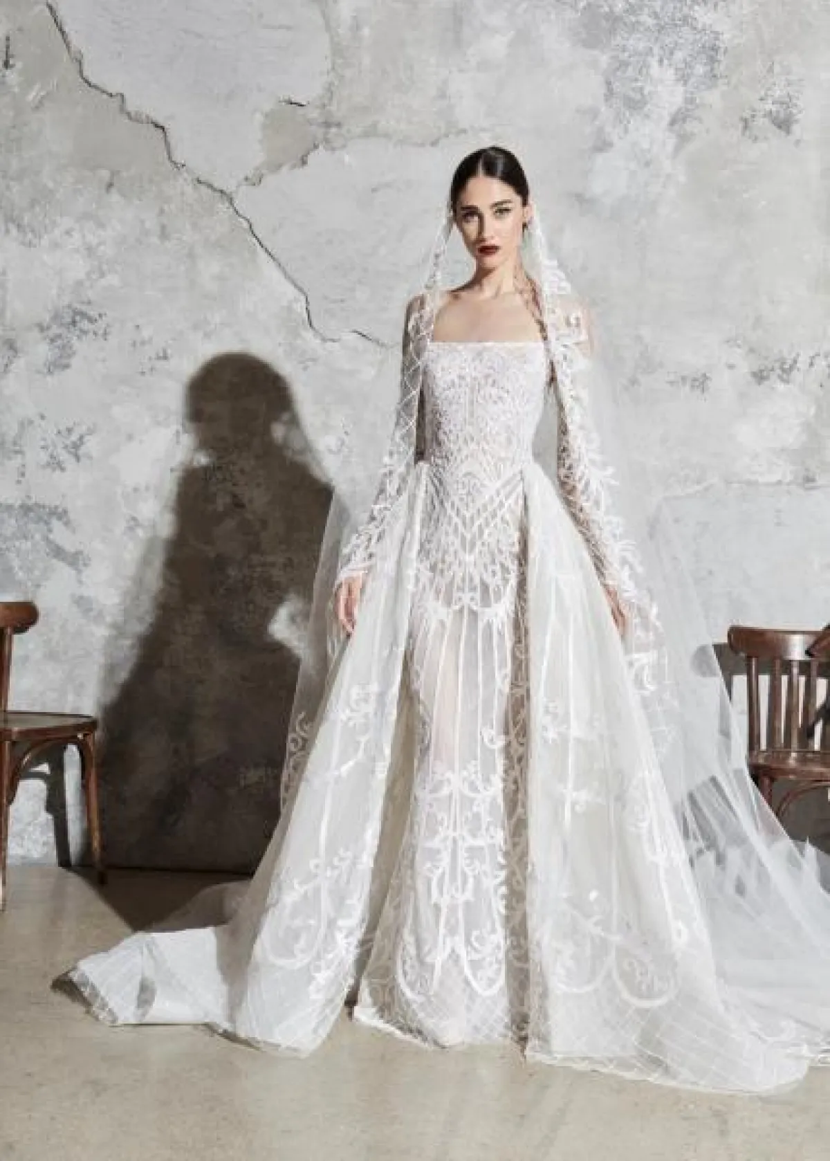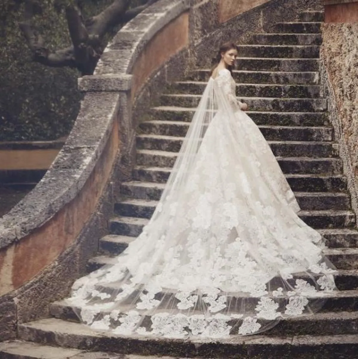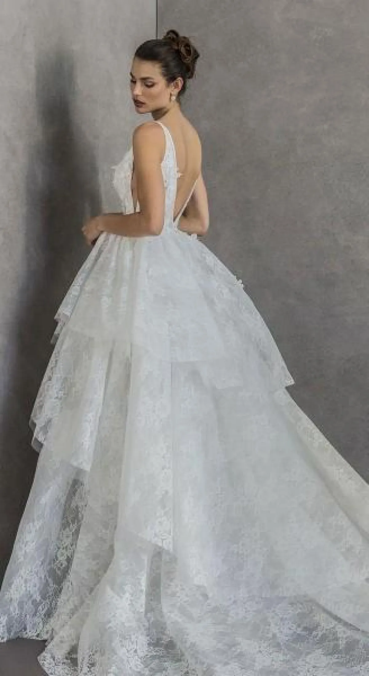 بصيحة الطبقات الرائجة، قدمت ماركة Valentini Spose فستان زفاف منفوش بقماش الدانتيل وبحمّالات مع ظهر مكشوف.