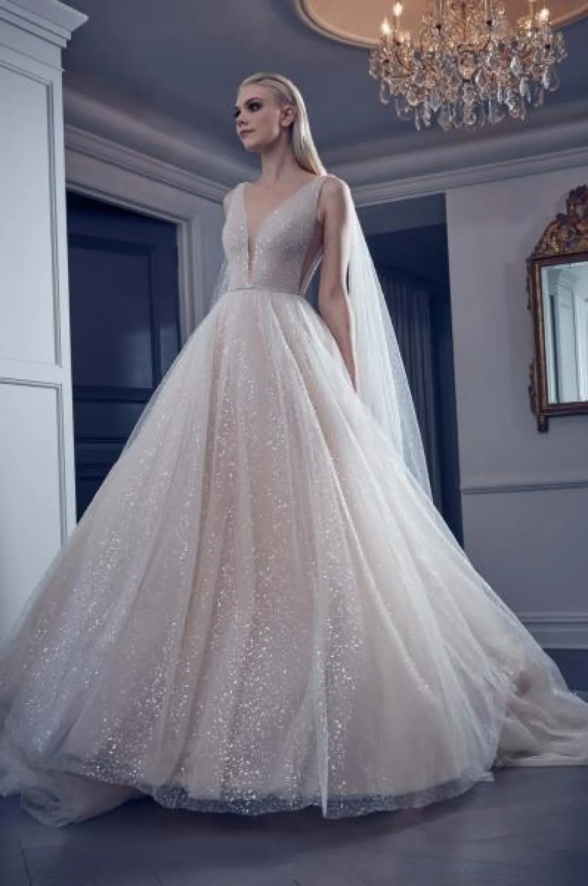 للعروس التي تبحث عن فستان زفاف فخم، نرشح لكِ هذا التصميم من رومونا كيفيزا والمزين بالغليتر البرّاق لمزيد من السحر والإبهار.
