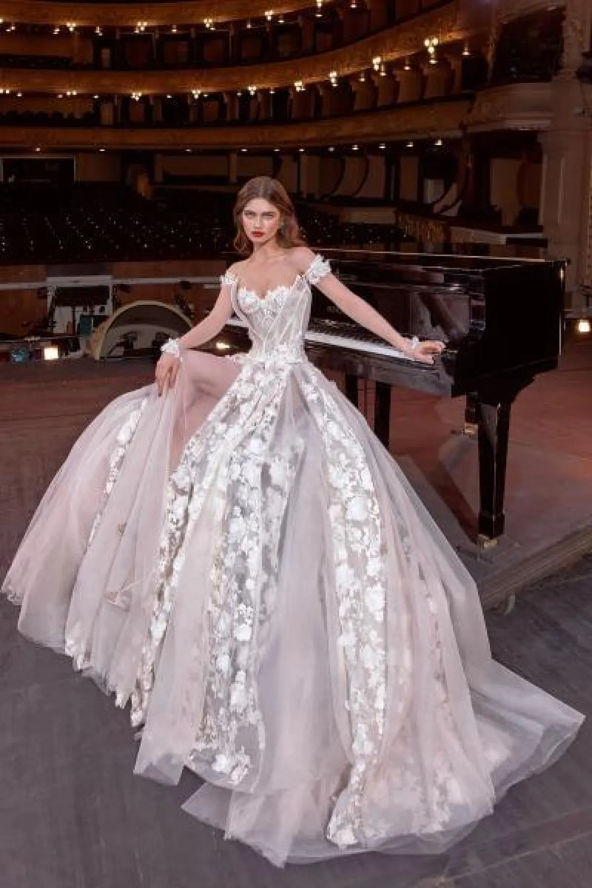 من ماركة بيرتا Berta، اخترنا لكِ تصميم يجمع بين الفخامة والأنوثة، فهو بتنورة منفوشة Ball Gown وبحمّالات منسدلة على الذراعين.