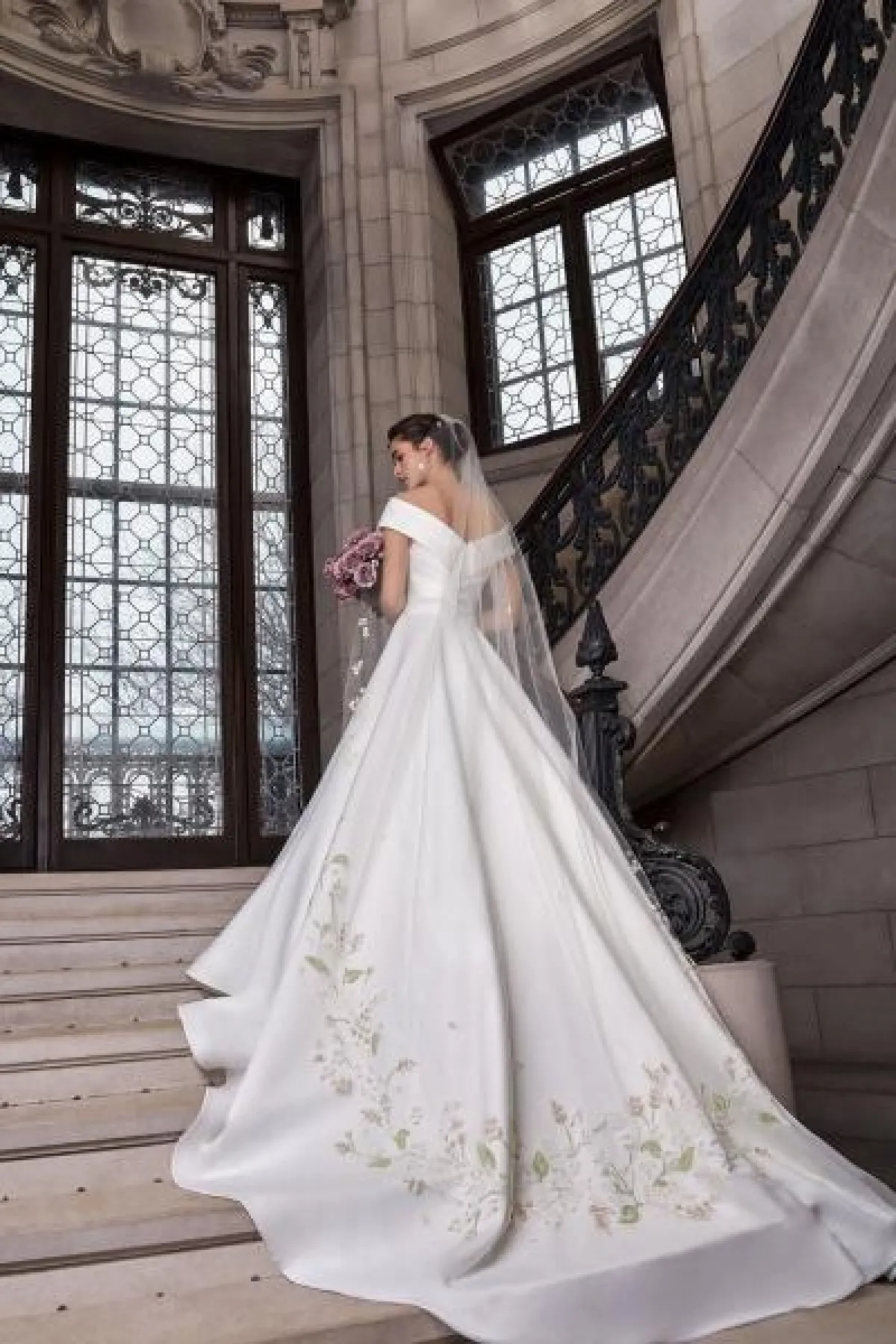يجمع فستان زفاف مونيك لولييه بين الرومانسية والإبهار، حيث التصميم المنفوش بالذيل الطويل مع كاب من التول المطرز بالورود البيضاء ليسدل على الفستان من الخلف بذيل يلامس الأرض.