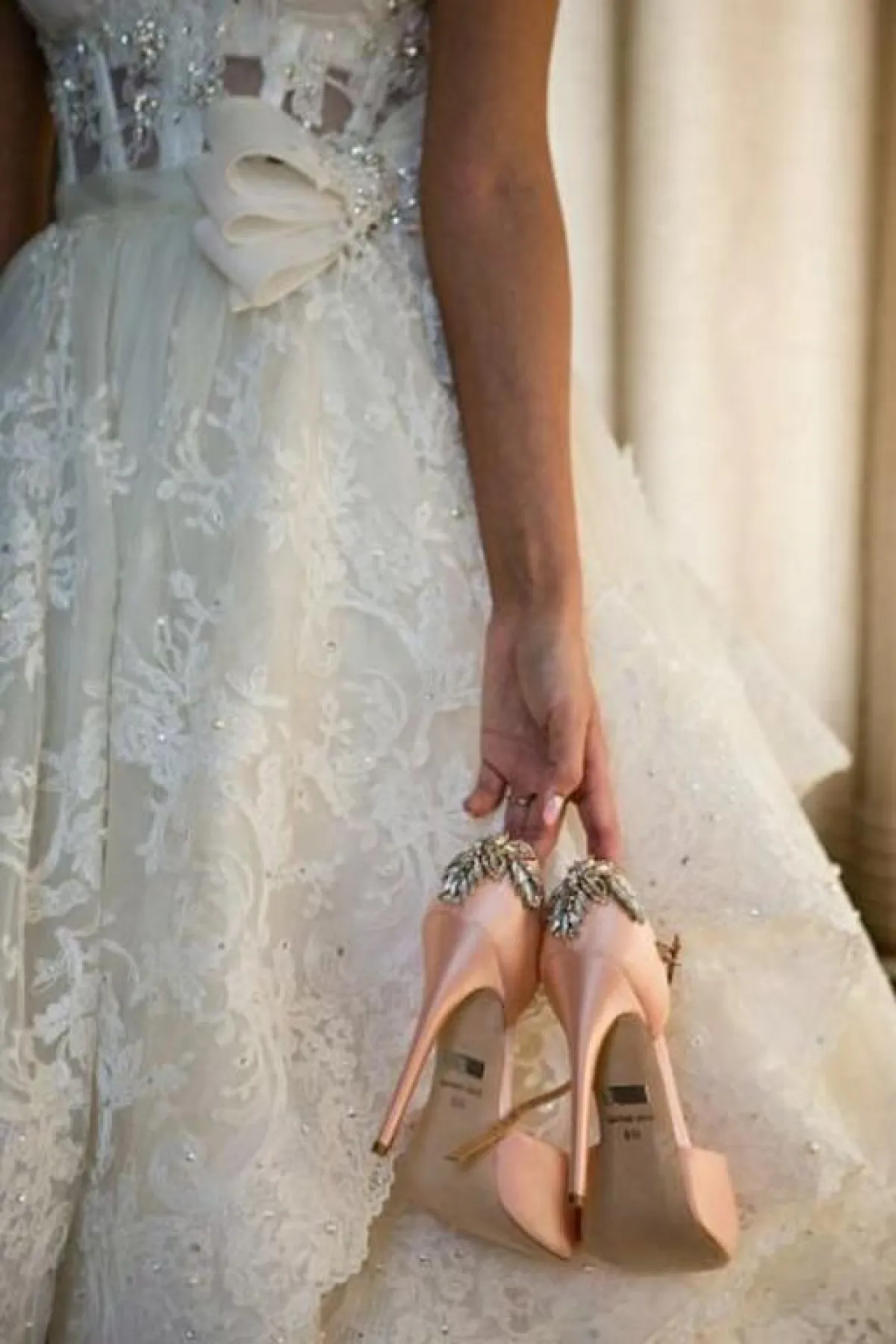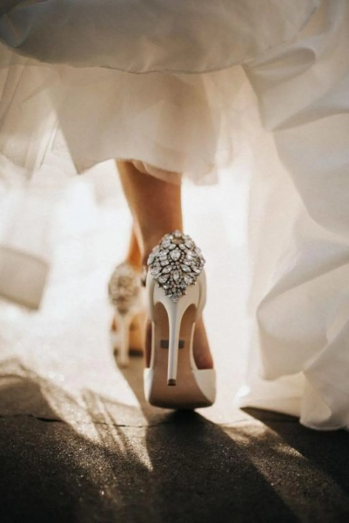 - من الممكن أن تختاري تلك التفاصيل الخاصة بالعروس، بصور ناعمة لحذائها المميز المرصع بالأحجار، لتضعي عليها كلامًا رمزيًّا مميزًا عن خطواتها الأنيقة نحو بيت الزوجية.