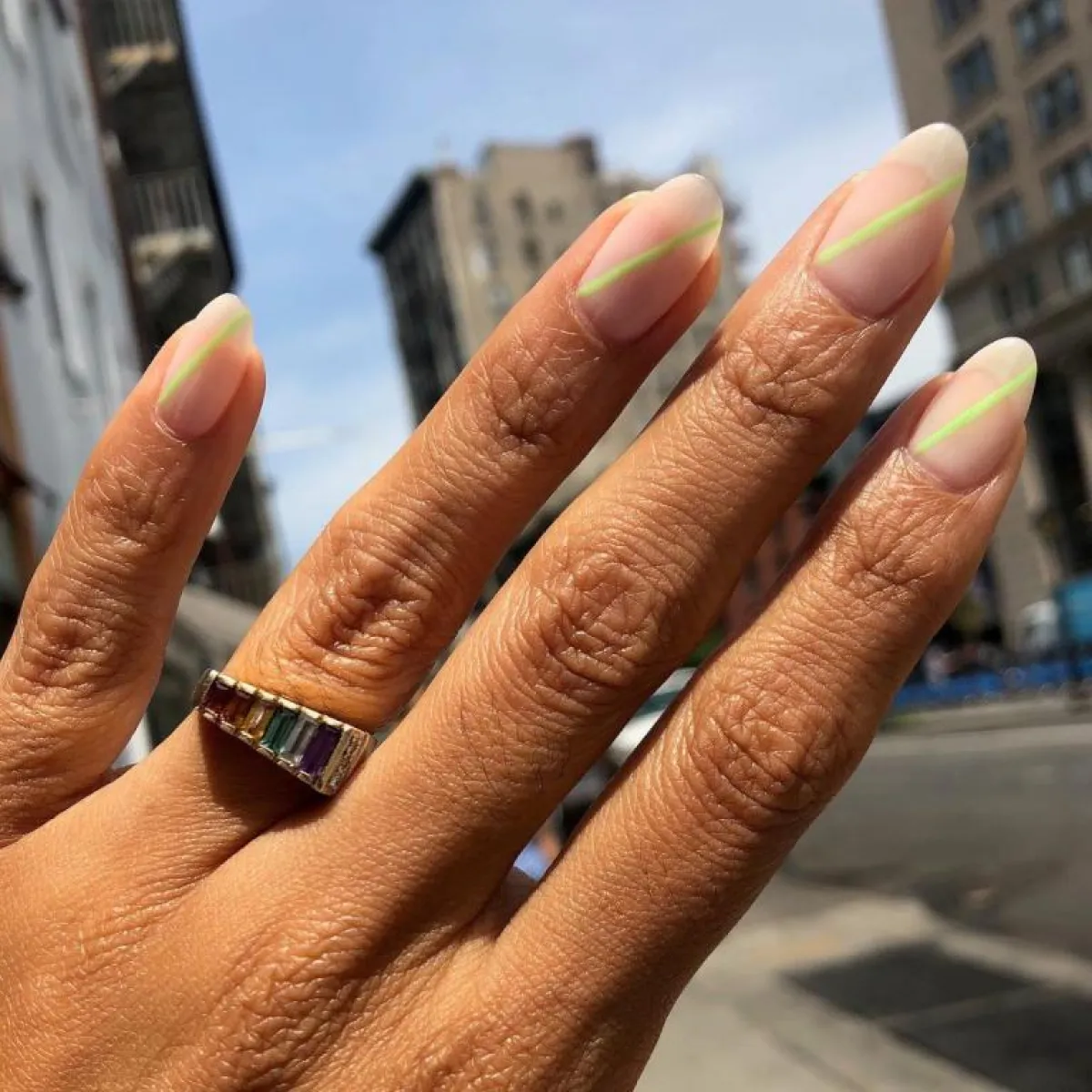 قد يكون الشتاء ليس الوقت المناسب لاستخدام درجات النيون الزاهية، إلا أنه بإمكانك خطوط النيون الشفافة على أظافرك بطريقة ناعمة تلائم أجواء الشتاء، بحيث تطبقين المناكير الشفاف على كامل أظافرك، من ثم ترسمين خطاً بلون النيون على كامل الظفر. ننصحك باستخدام Paintbox Nail Lacquer in Like Spring وZoya Nail Polish in Tilda.