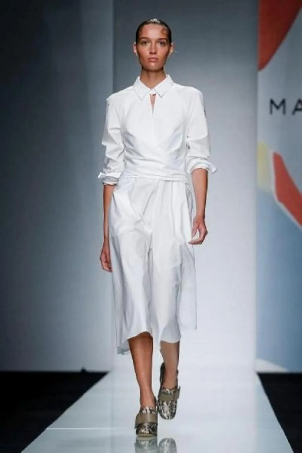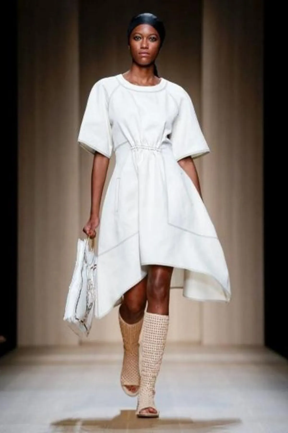 تسابقت ماركات كثيرة على تقديم الفستان الأبيض بسيط التفاصيل والذي يناسب طلعات النهار، نرشح لكِ الفستان الـ V Neck الذي يعلو الركبة من مجموعة بوتيغا فينيتا Bottega Veneta ليساعدك في إطالة قامتك، أما فستان ماركة جيني Genny المزدان بكشاكش حول الخصر ومصمم بتنورة منفوشة فننصحك به لإخفاء بروز البطن.