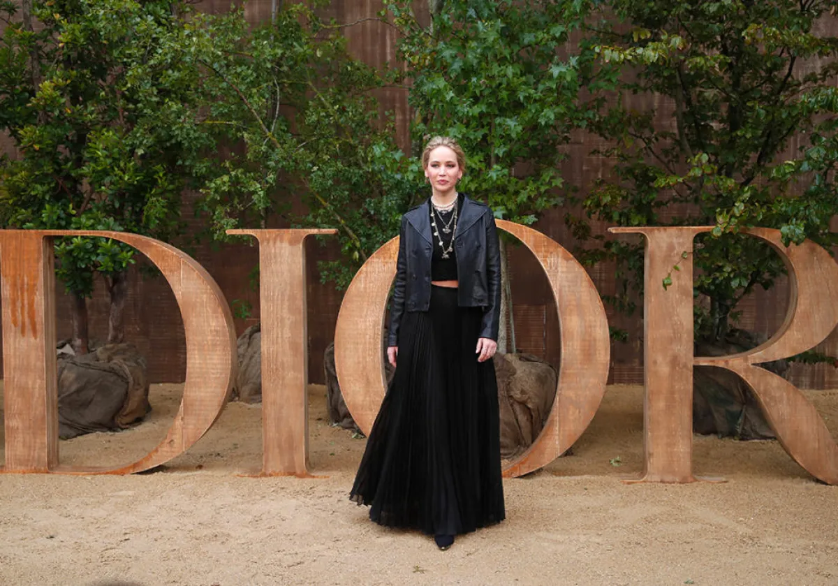 اختارت جنيفر لورانس Jennifer Lawrence لوك شبابيًّا أنيقًا لحضور عرض ديور Dior، وكان عبارة عن تنورة بليسيه ماكسي، نسقت معها توب قصيرًا ومن فوقهما اختارت جاكيت قصير من الجلد، وقد زينت اللوك بالعديد من المجوهرات الذهبية.