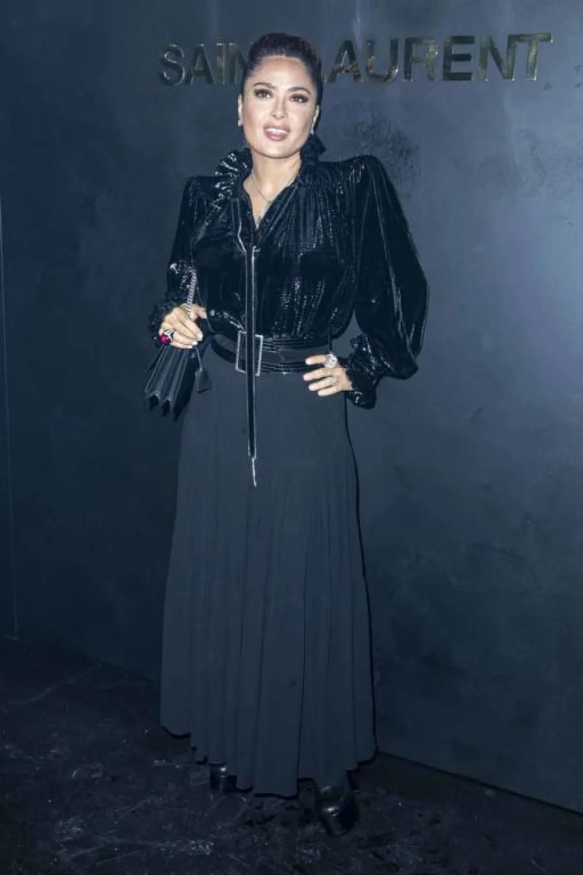 حضور سلمى حايك Salma Hayek لعرض دار سانت لوران Saint Laurent كان مميزًا لا سيّما وأنها اختارت اطلالة أنيقة بالأسود، كانت عبارة عن قميص مصنوع من قماش لامع، نسقت معه تنورة ماكسي كانت قد زينت خصرها بحزام عريض، وأكملت اللوك بحذاء من الجلد وشنطة يد حملت توقيع الدار طبعًا.