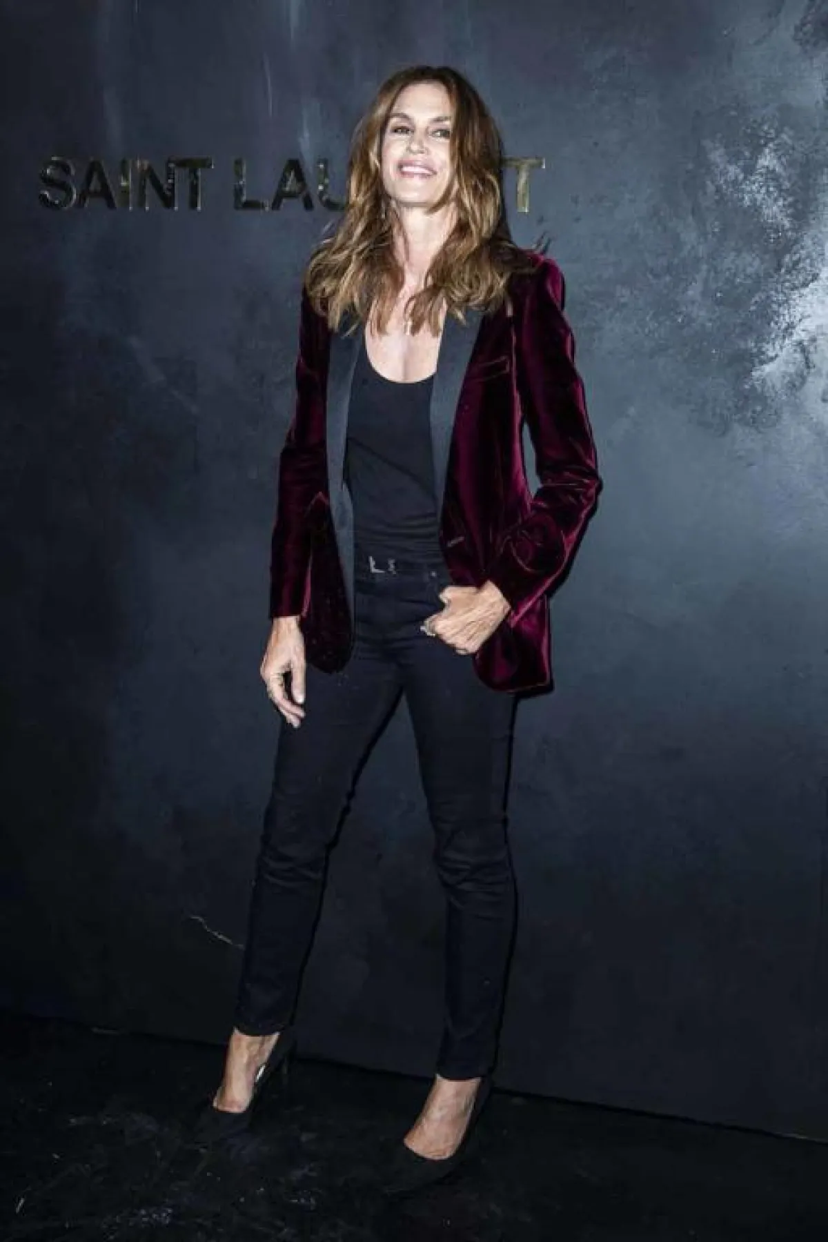 عارضة الأزياء الشهيرة كايت موس Kate Moss من أصدقاء دار سانت لوران Saint Laurent، ودائمًا ما تحضر عروض الدار باطلالات أنيقة مثل هذه الاطلالة العصرية التي اعتمدت فيها على الأسود، وقد اختارت بنطلونًا من الجلد مع توب من قماش الشيفون ومن فوقهما جاكيت بليزر بقصة التوكسيدو، وأكملت اللوك بحذاء بكعب عالٍ وحقيبة كلاتش أنيقة.
