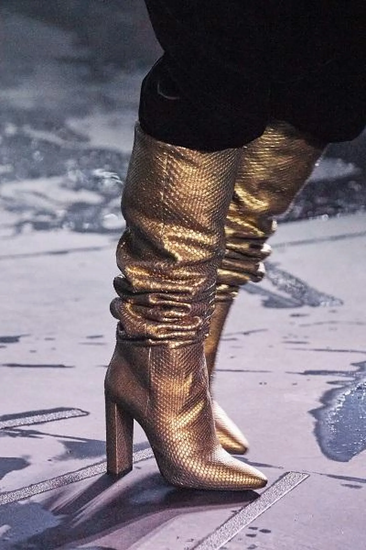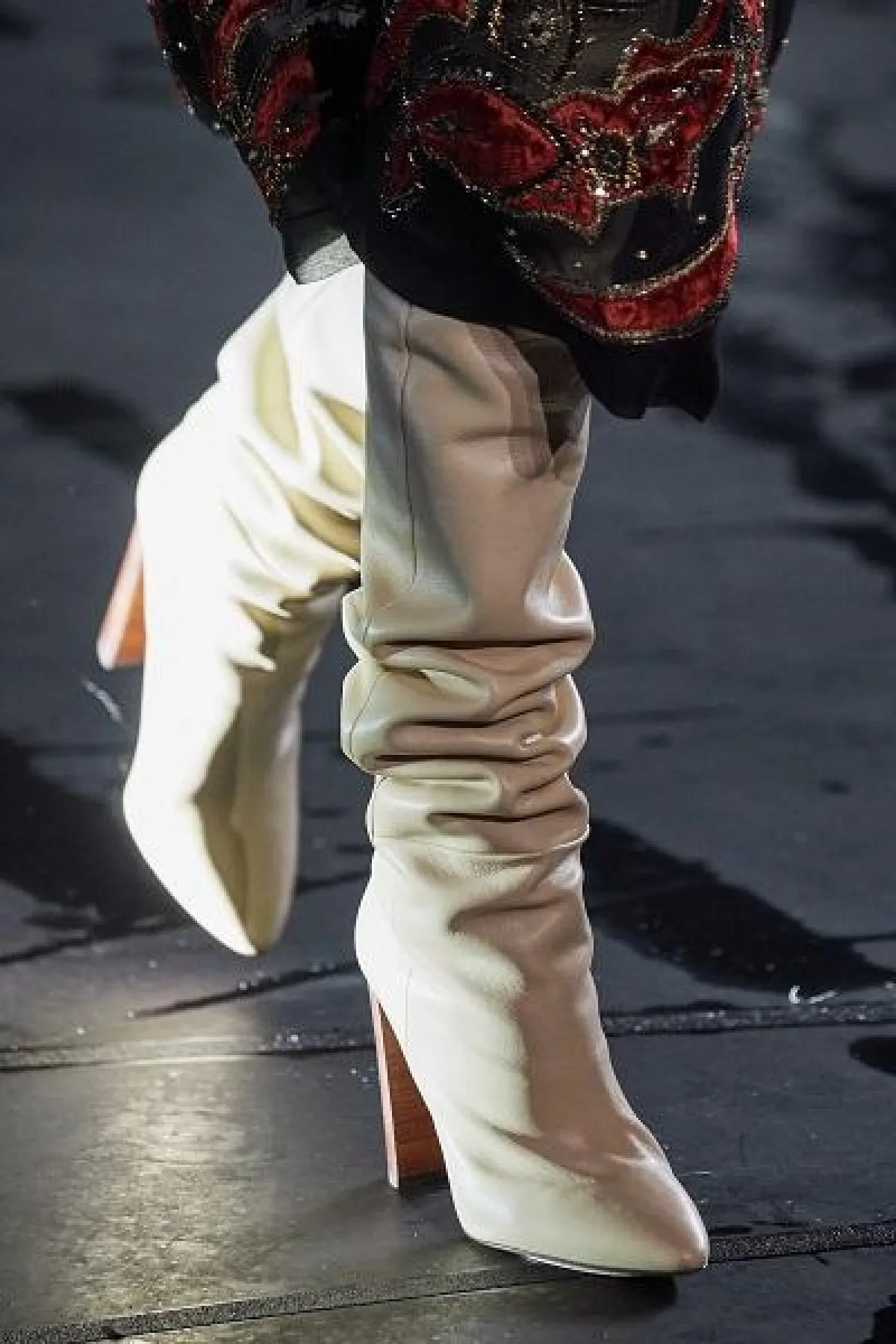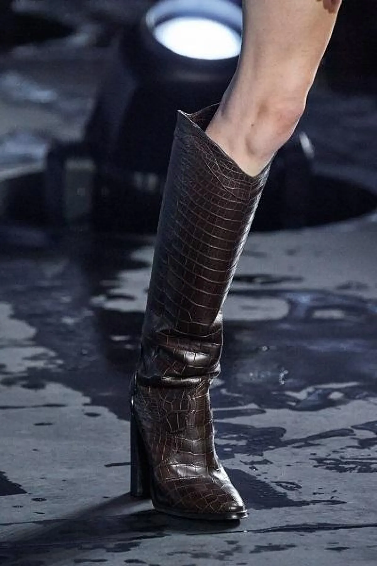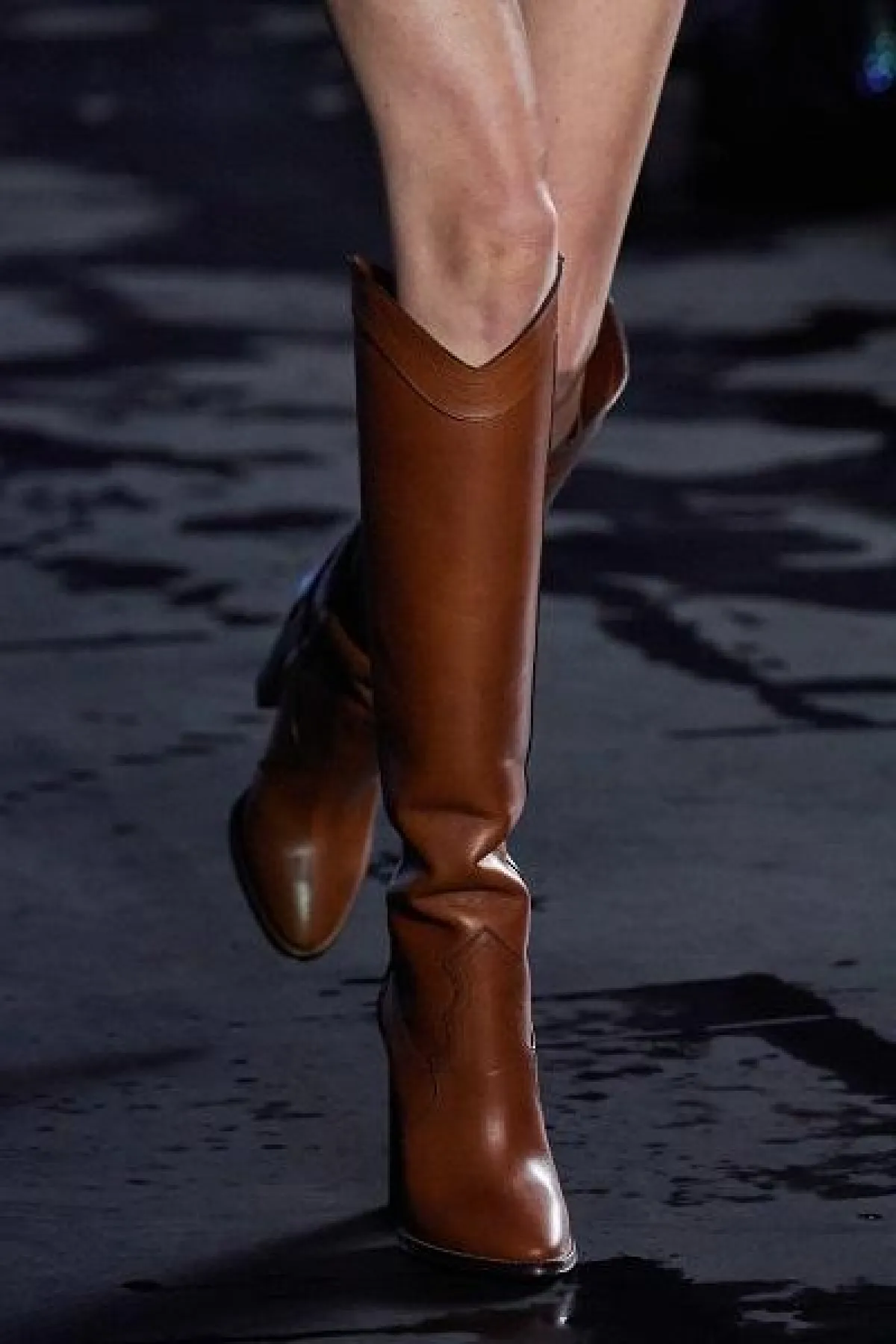 كذلك، شاهدنا البوط الجلدي العالي على منصة سان لوران Saint Laurent بألوان حيادية كلاسيكية تراوحت بين الأسود والبني والكاميل والبيج حتى للمسة ربيعية منعشة.
