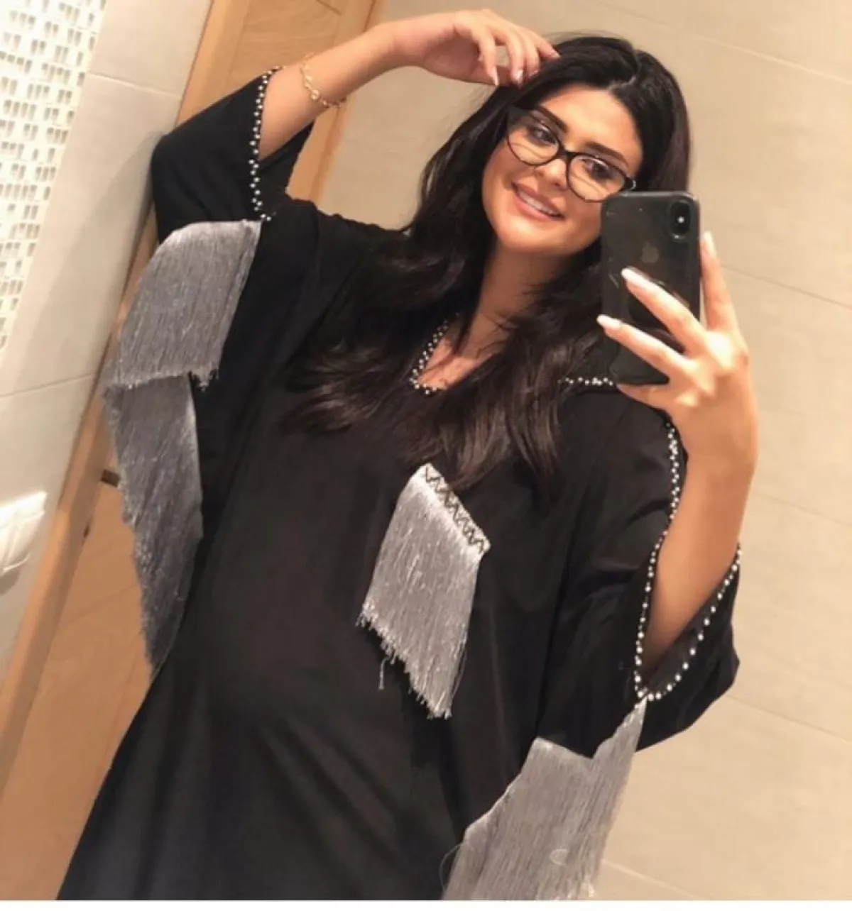 لفتنا هذا الجلباب الأسود الواسع الذي اختارته سلمى، مع تطريزات الشراشيب الفضية على الأكمام، والجيب الأمامي على الصدر، مناسب للسيدات في الشهور الأولى من الحمل، ويمكنكِ اعتماده كعبايه استقبال بسيطة لضيوفِك.