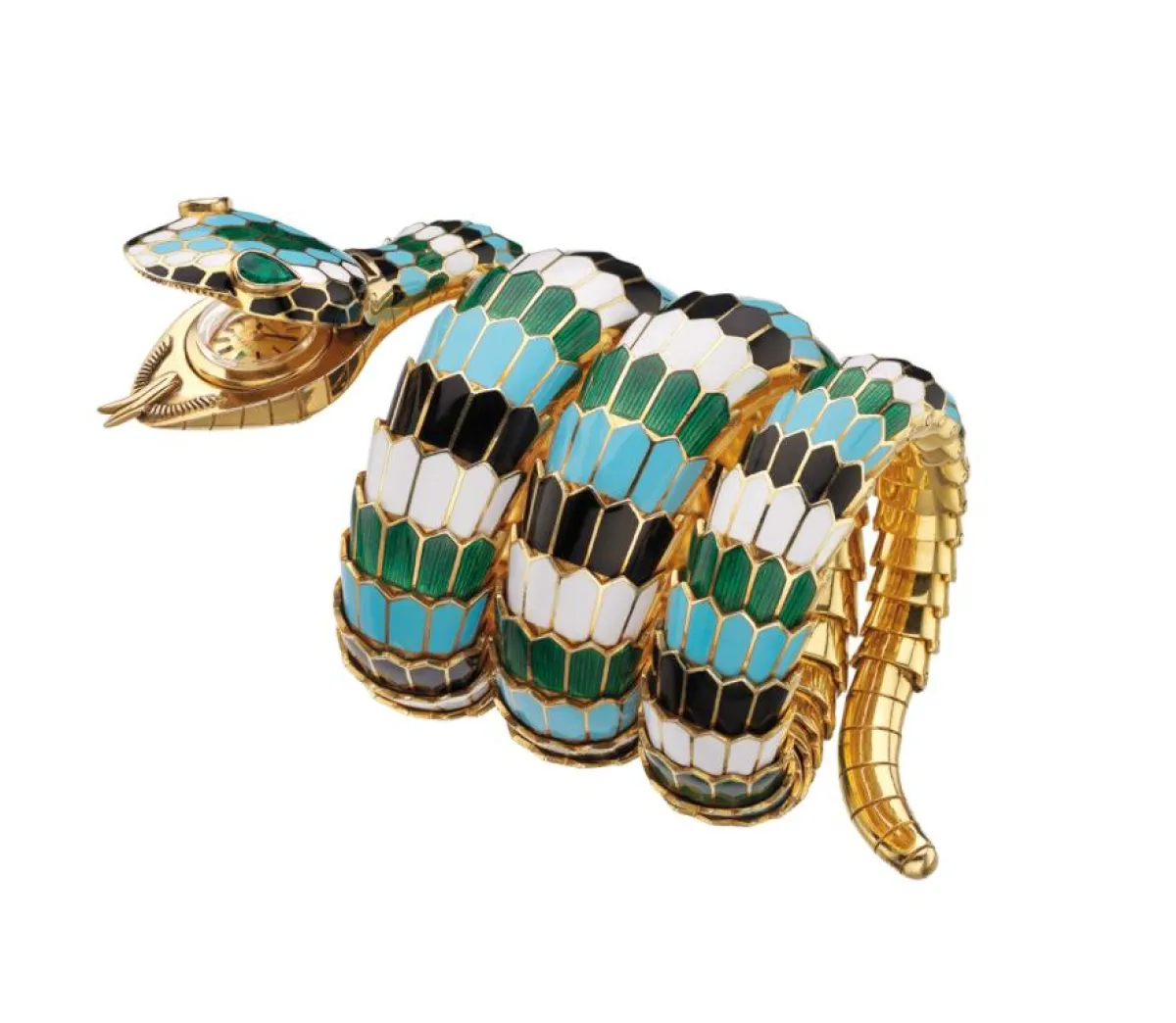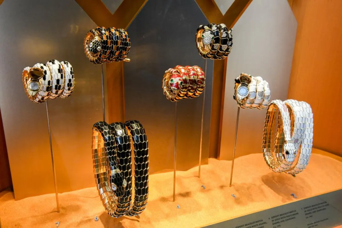 وقد لفت انتباهنا في هذا المعرض قلادة نادرة من المينا متعددة الألوان من مجموعة سربينتي Serpenti، يعود تاريخها إلى عام 1969 وهي الوحيدة من نوعها حاليًّا في مجموعة بولغري التراثية – وتأتي على شكل قطعة مخملية الملمس من الصفير، مقصوصة بأسلوب كابوشون cabochon.الذي يتوج رأس الأفعى، كما توقفنا عند النماذج المصنّعة من ألوان الذهب المختلفة في توليفات لونية جريئة، وحرفية فائقة التعقيد والتطور.