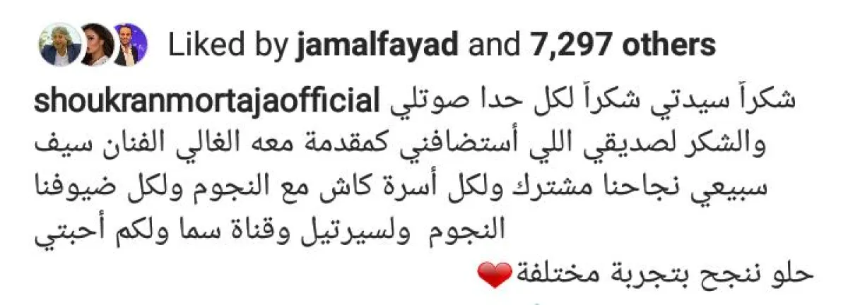 وعلقت شكران مرتجى على النتيجة "شكراً سيدتي شكراً لكل من صوّت لي والشكر لصديق الذي إستضافني كمقدمة معه الغالي سيف السبيعي نجاحنا مشترك ولكل أسرة كاش مع النجوم ولكل ضيوفنا النجوم ولسيرتيل وقناة سما ولكم أحبتي. حلو النجاح بتجربة مختلفة".