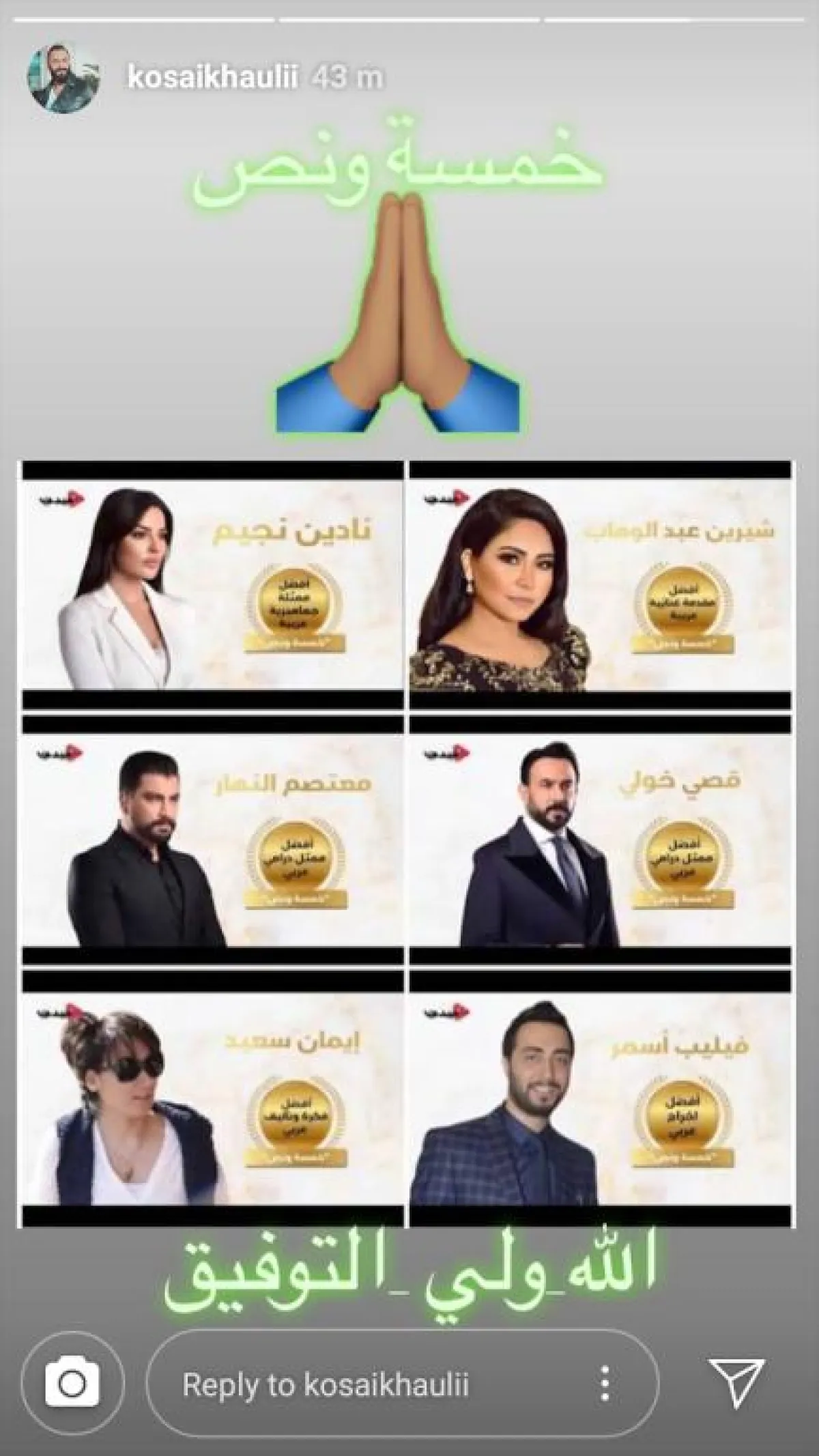 قصي خولي الذي فاز بجائزة أفضل ممثل درامي عربي عن مسلسل "خمسة ونص" نتيجة إستفتاء مجلة سيدتي للموسم الرمضاني 2020، نشر صوراً لمخرج المسلسل فيليب أسمر والكاتبة إيمان السعيد والفنانة شيرين عبد الوهاب التي غنت شارة المسلسل، وشريكته في النجاح نادين نجيم للتأكيد على فخره بالنجاح الكبير الذي حققه هذا المسلسل والمشاركين في صناعته.