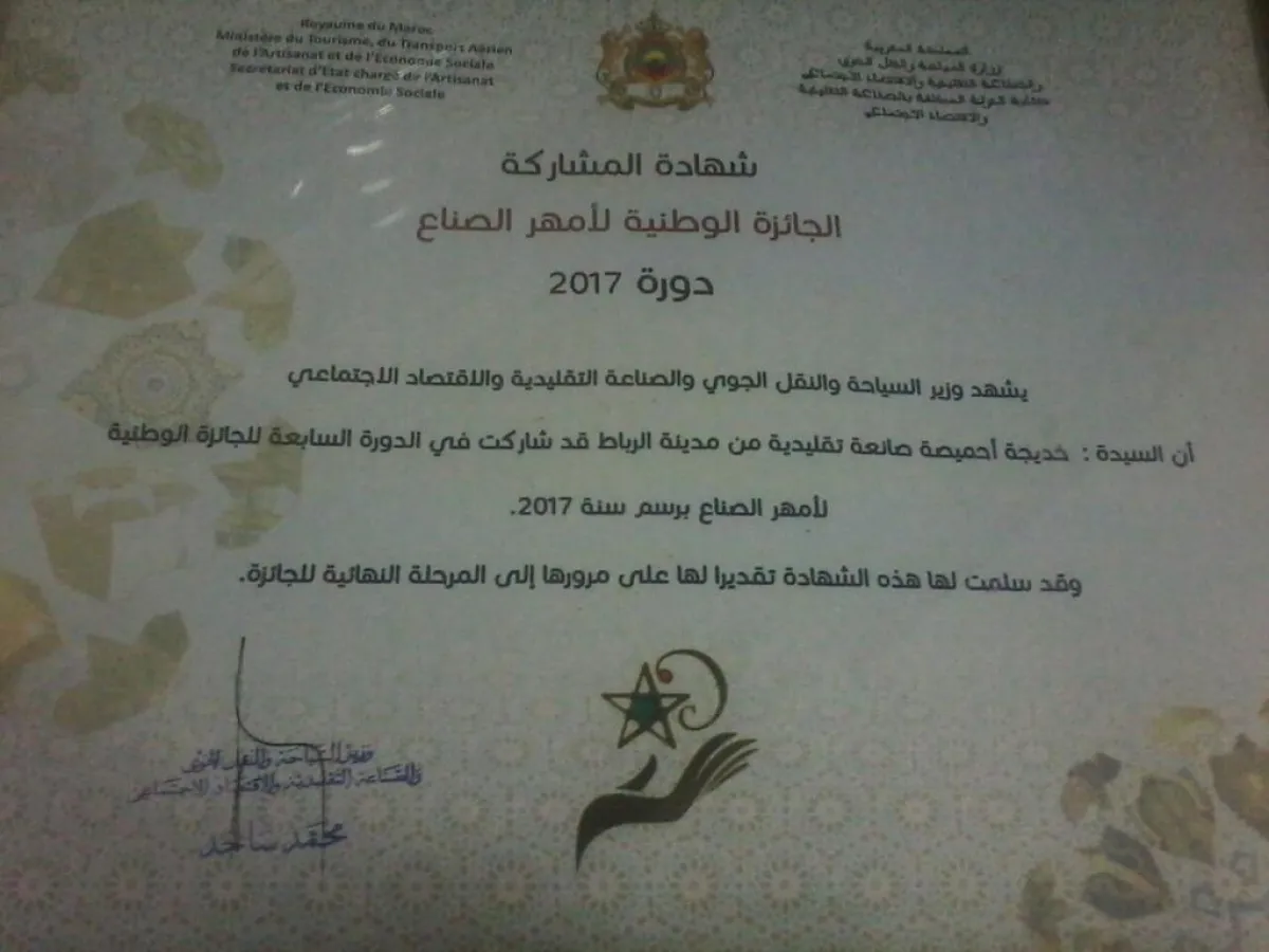 أسست المغربية خديجة احميصة، تعاونية باسم «لمسات خديجة للحلي والمجوهرات»، تشرف من خلالها على تأطير مجموعة من النساء يشتغلن كخلية نحل في الحرير لصنع أطقم مميزة بلمسات عصرية، حاصلة على شارة الجودة الوطنية لسنة 2018، وجائزة «أمهر الصناع» لسنتي 2017 و2019 من وزارة الصناعة التقليدية في المغرب.