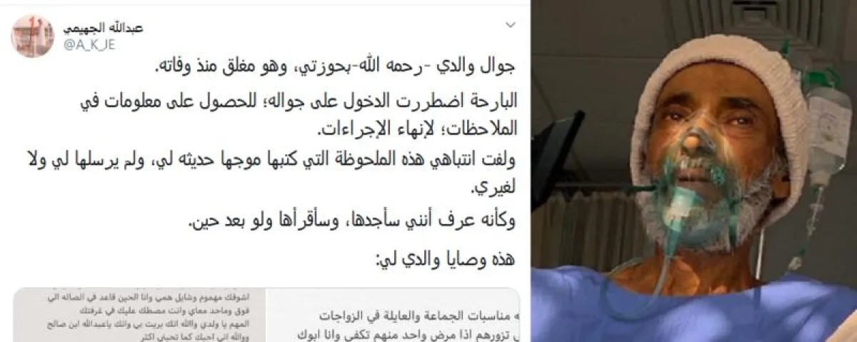 بدوره روى الابن عبدالله الجهيمي على صفحته على «تويتر» كيف عثر على الوصية قائلًا: «جوّال والدي -رحمه الله- بحوزتي، وهو مغلق منذ وفاته، البارحة، اضطررت إلى الدخول على جوّاله؛ للحصول على معلومات في الملاحظات؛ لإنهاء الإجراءات، ولفت انتباهي هذه الملحوظة التي كتبها موجهًا حديثه لي، ولم يرسلها لي ولا لغيري، وكأنه عرف أنني سأجدها، وسأقرأها ولو بعد حين».