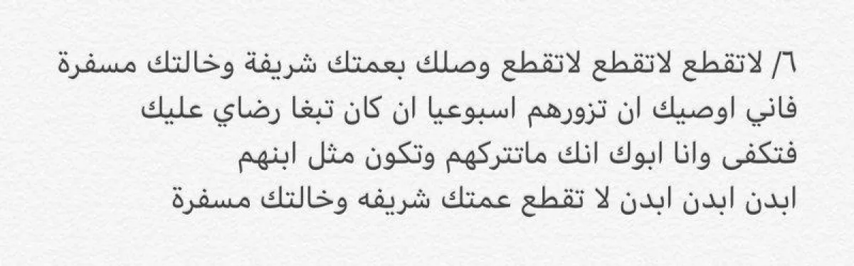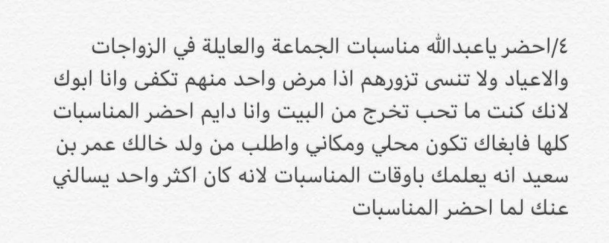 «عظم الله أجركم ورحم والدكم رحمة واسعة وجعله من أهل جنة النعيم.. وصية جميلة من أب صالح لابنه البار.. لم يترك لكم مليارات وعقارات ولكن ترك لكم شي أكبر وأغلى من الدنيا وما فيها طلب منك رضا الله ثم رضا أمك والمحافظة ع اخوتك وقرابتك؛ وهكذا يكون الرجال حقًا _رحمك الله».