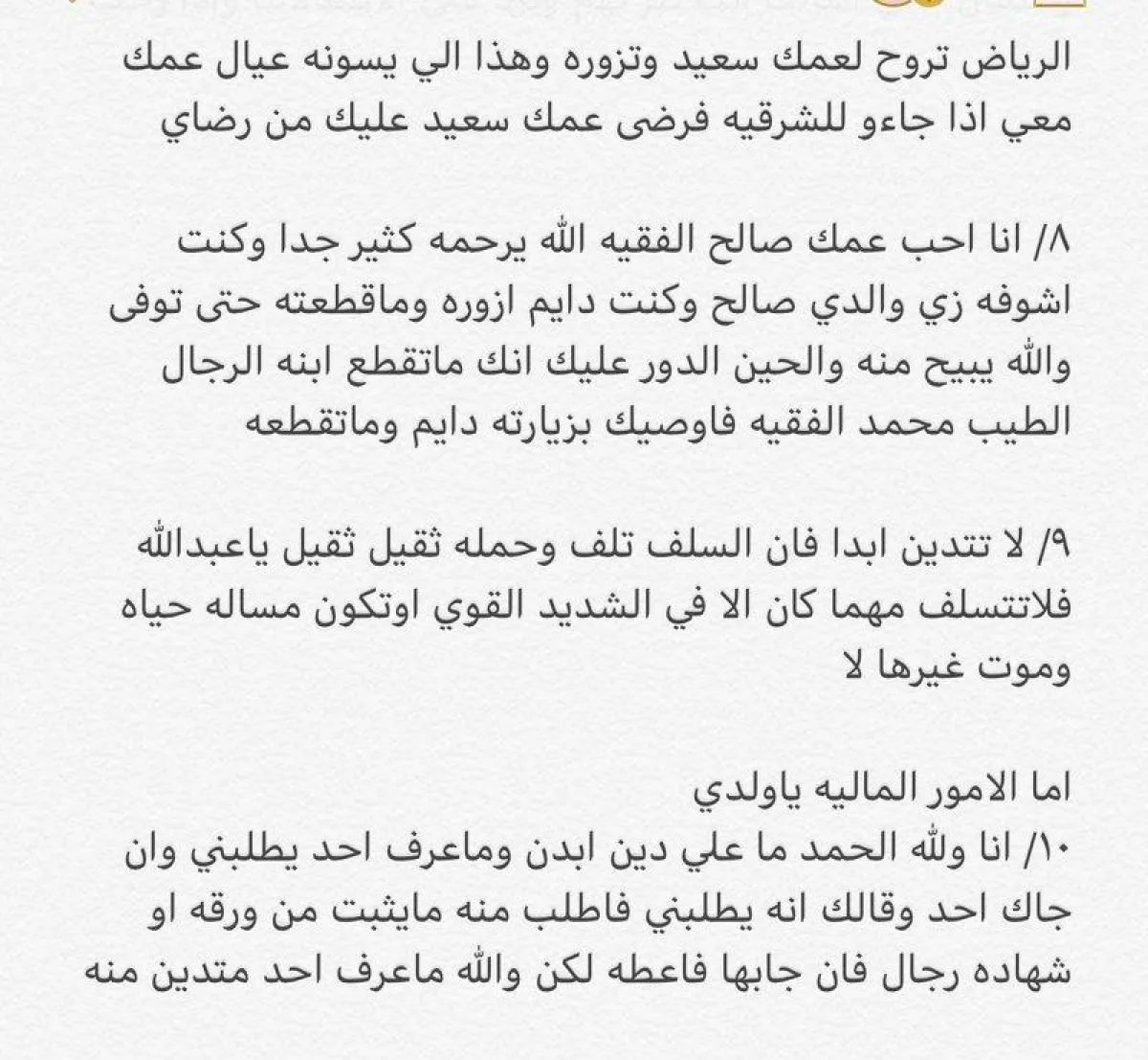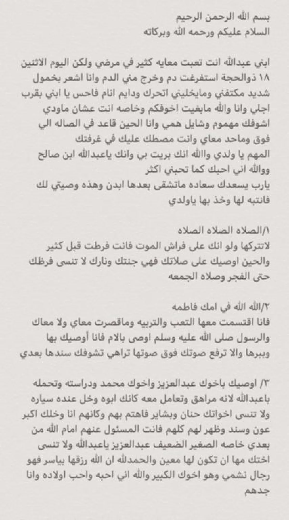 ويؤكّد الأب في الوصية كم كان ابنه عبد الله بارًا به، ويعلن له حبه ورضاه عنه، وقد تضمنت الوصية 10 بنود، تبدأ بالحفاظ على الصلاة، إلى رعاية الأم والإخوة، ثم صلة الرحم، والحرص على التواصل العائلي والحديث عن الأموال والاستدانة، وأخيرًا أعلن الأب أنه كان يتمنى أن يمد الله في عمره ليرَ ابنه موظفًا في أرامكو أو في مكان كبير.