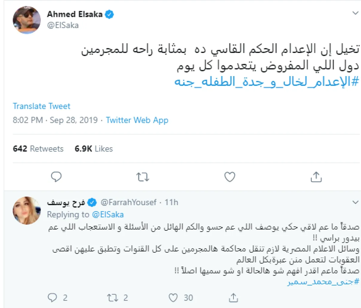 السقا غرد عبر حسابه بموقع تويتر تفاعلا مع هاشتاق الإعدام لخال وجدة الطفلة جنى قائلا: تخيل إن الإعدام الحكم القاسي ده بمثابة راحه للمجرمين.. دول اللي المفروض يتعدموا كل يوم