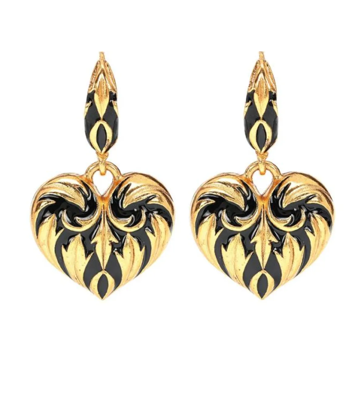 وعلى هذا الأساس اعتمدت العديد من دور المجوهرات العالمية على تقديم قطعها باللونين الأسود والذهبي، فلفتت نظرنا بشدة الأقراط من Oscar de la Renta التي جاءت بتصميم القلب وبحجم كبير، حيث تداخل الأسود مع الذهبي بأسلوب مبهر.