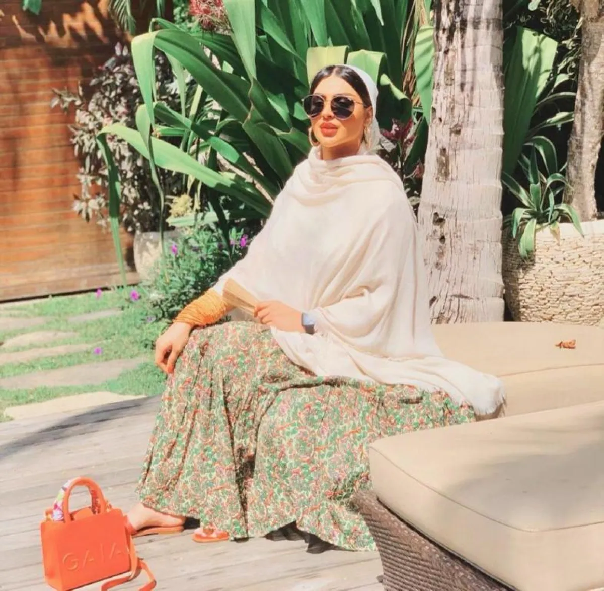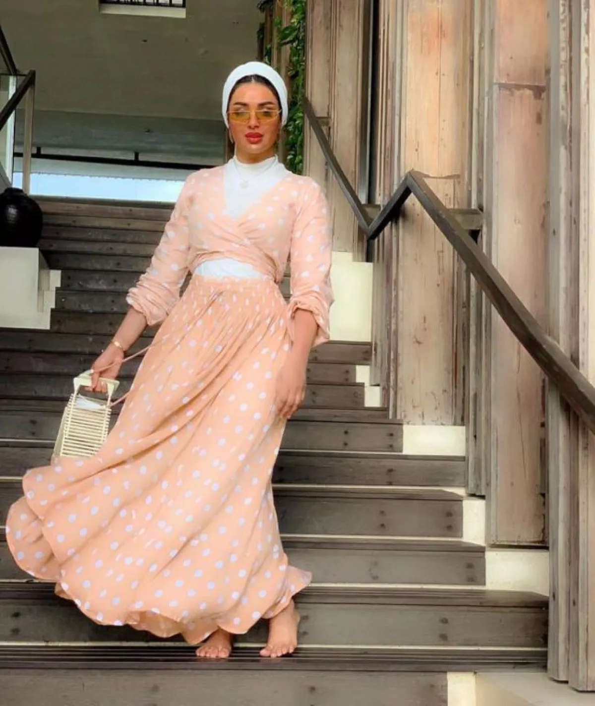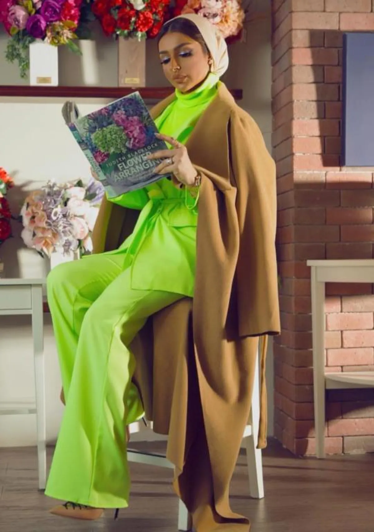 ولمظهر مفعم بالألوان اختارت بلوزة وبنطالاً بدرجة الأخضر النيون ومعطفًا طويلاً بنيًّا، وتألقت بتنورة وبلوزة باللون الزهري الفاتح تزينهما نقاط بيضاء، وظهرت بإطلالة رياضية مناسبة للسفر ببنطال وجاكيت باللون الأسود بخطوط جانبية بيضاء، وتميزت بإطلالة صيفية مذهلة بفستان أخضر مورد ووشاح بيج يناسبان السفر.