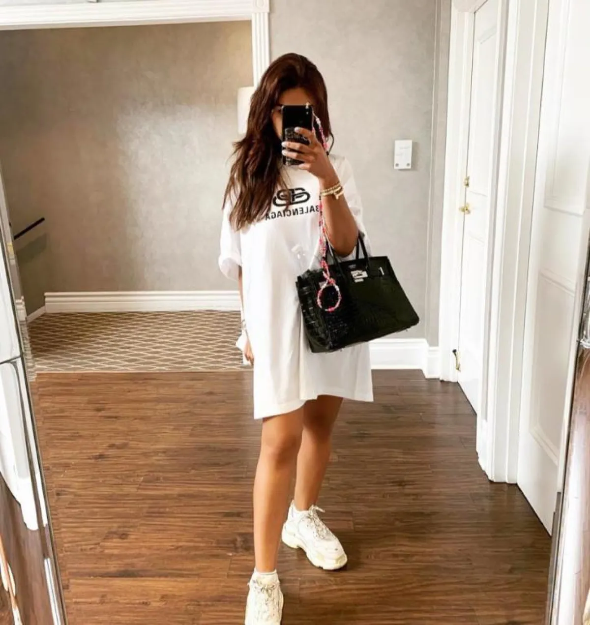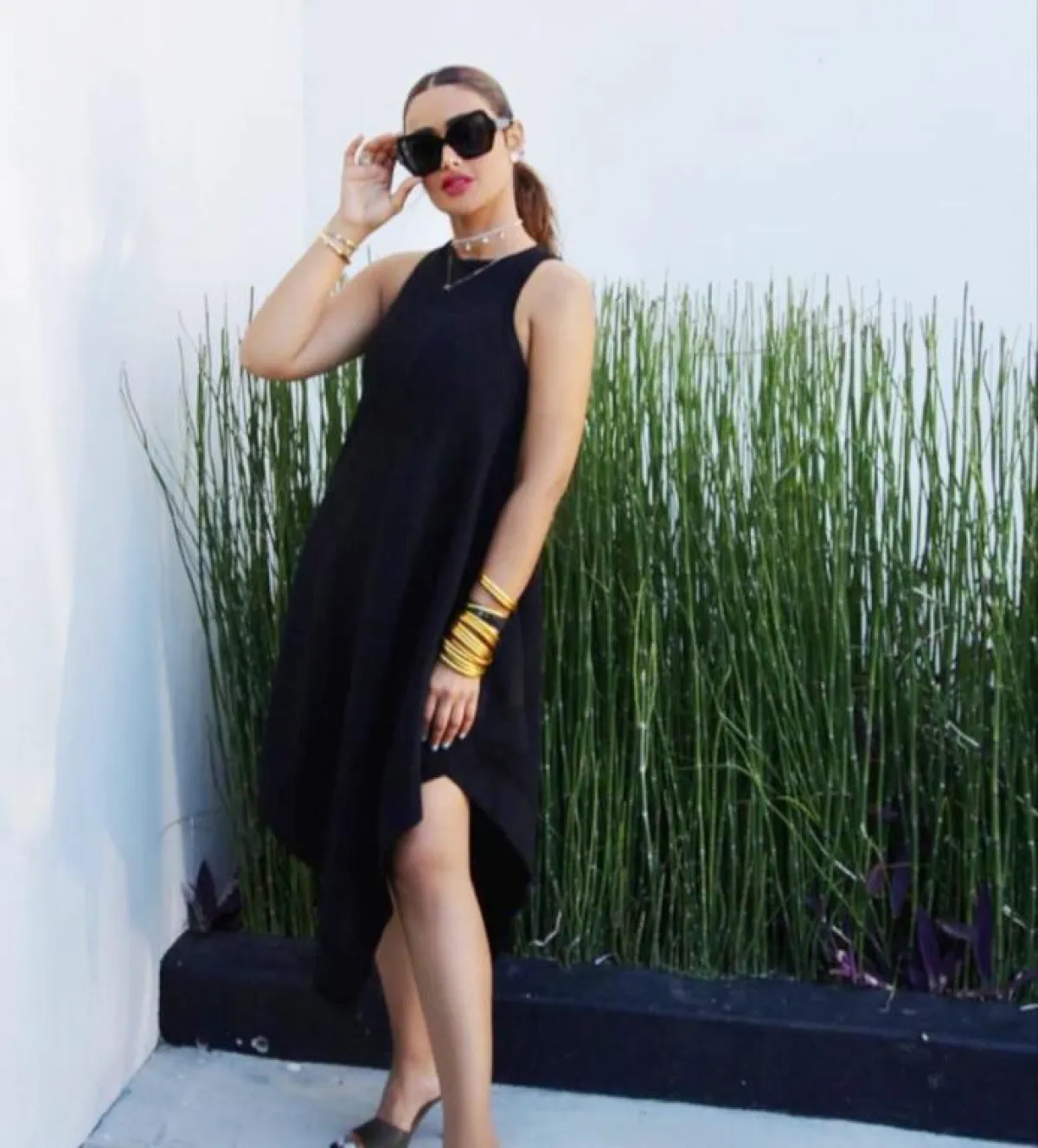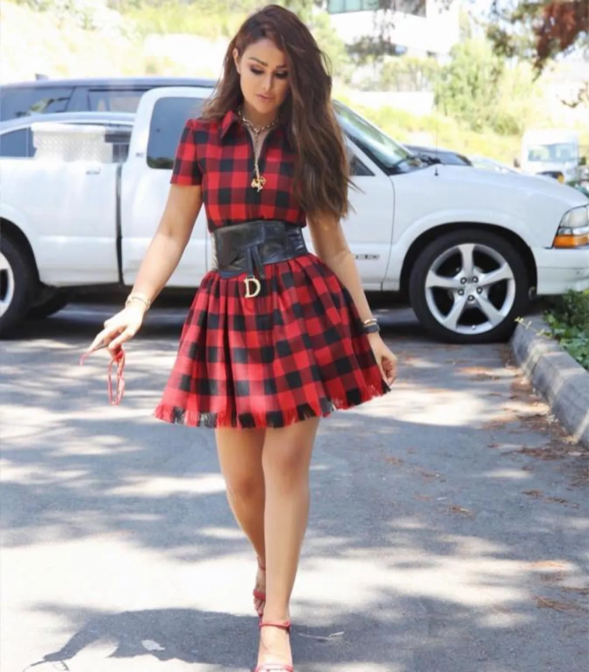 وعن الفساتين فقد تجمَّلَتْ بفستان أحمر قصير بكاروهات وحزام خصر عريض، وفستان أبيض قصير بكتابة سوداء وحقيبة سوداء، وأطلَّت بآخر بتصميم أسود منسدل وزيَّنَتْه باكسسوارات عدة ذهبية مميزة.