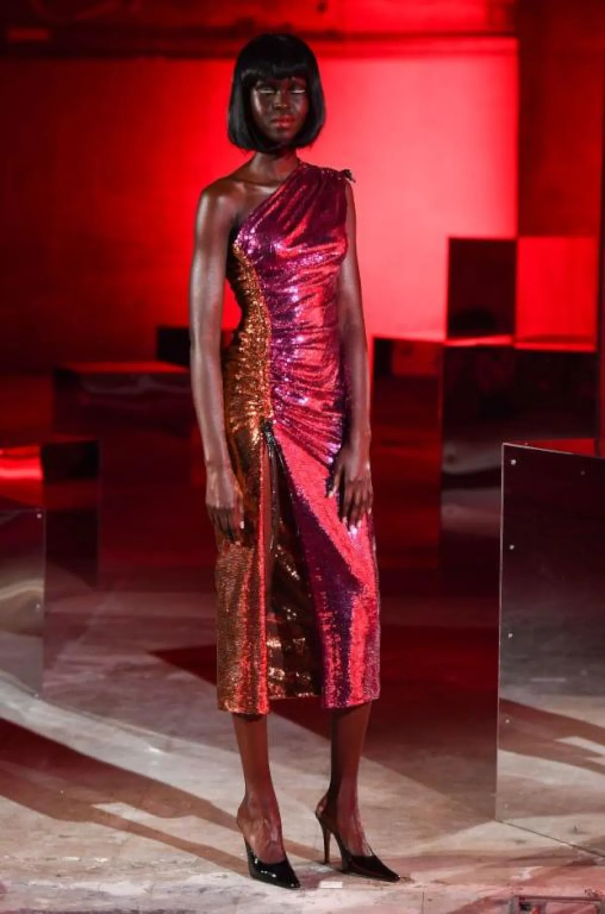 من التصميمات المميزة التي أعجبتنا بمجموعة Halpern، هو هذا الفستان الفضي بصيحة الكتف الواحدة، مناسب لكل الصبايا، ومثالي للسمراوات، وسوف تبدين بهذا الفستان كالنجمات، وهو بالطبع ما تبحث عنه كل صبيّة بحفل خطوبتها.