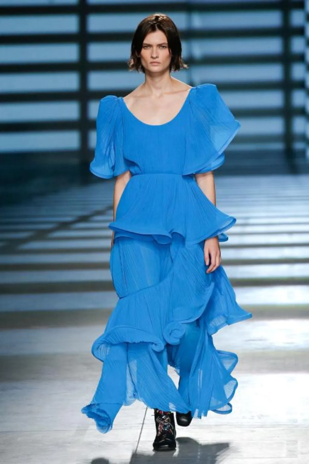 أما إن كان حفل خطوبتكِ بسيطًا جدًّا، ولا تحتاجين إلى الكثير من التطريزات والاطلالات الفخمة، من الممكن أن تلجئي إلى الفساتين الكشكش، مع اللمسة الطبقية لكشكشة، لاطلالة عصرية، كهذا الفستان من Preen by Thornton Bregazzi مع لونه الازرق المنعش.
