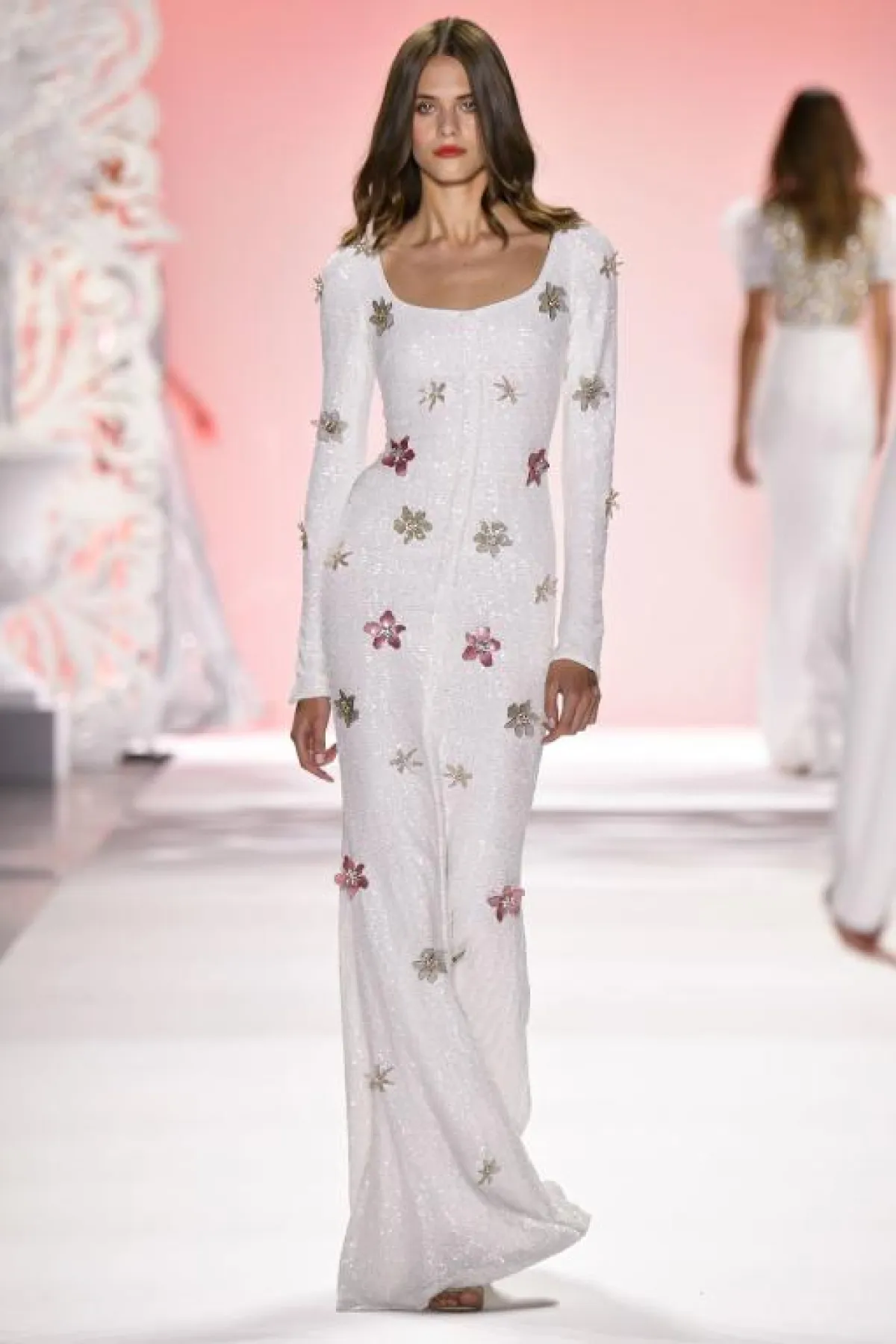 أصبح الكثير من الصبايا الآن يرتدين اللون الأبيض بحفل الخطوبة، كنوع من كسر القيود بعالم الموضة، وأنسب ما يمكنك اختياره لحفلتِك، هو هذا الفستان الأنيق مع الأكمام الطويلة وتطريزات النجوم البراقة من Badgley Mischka.
