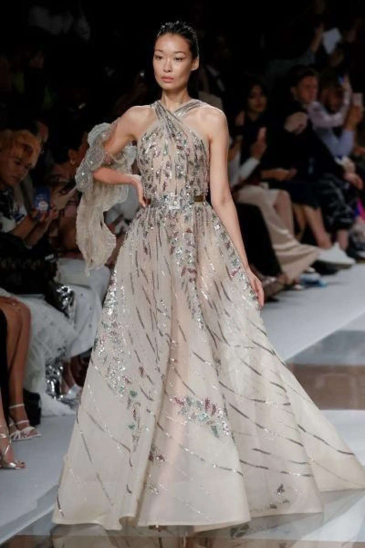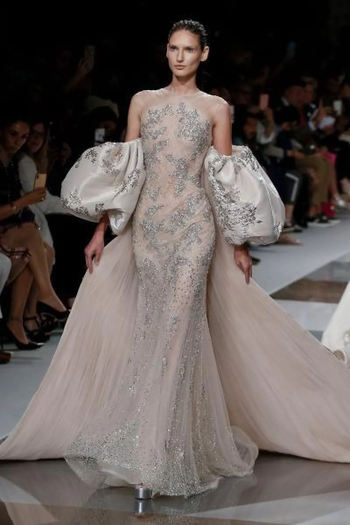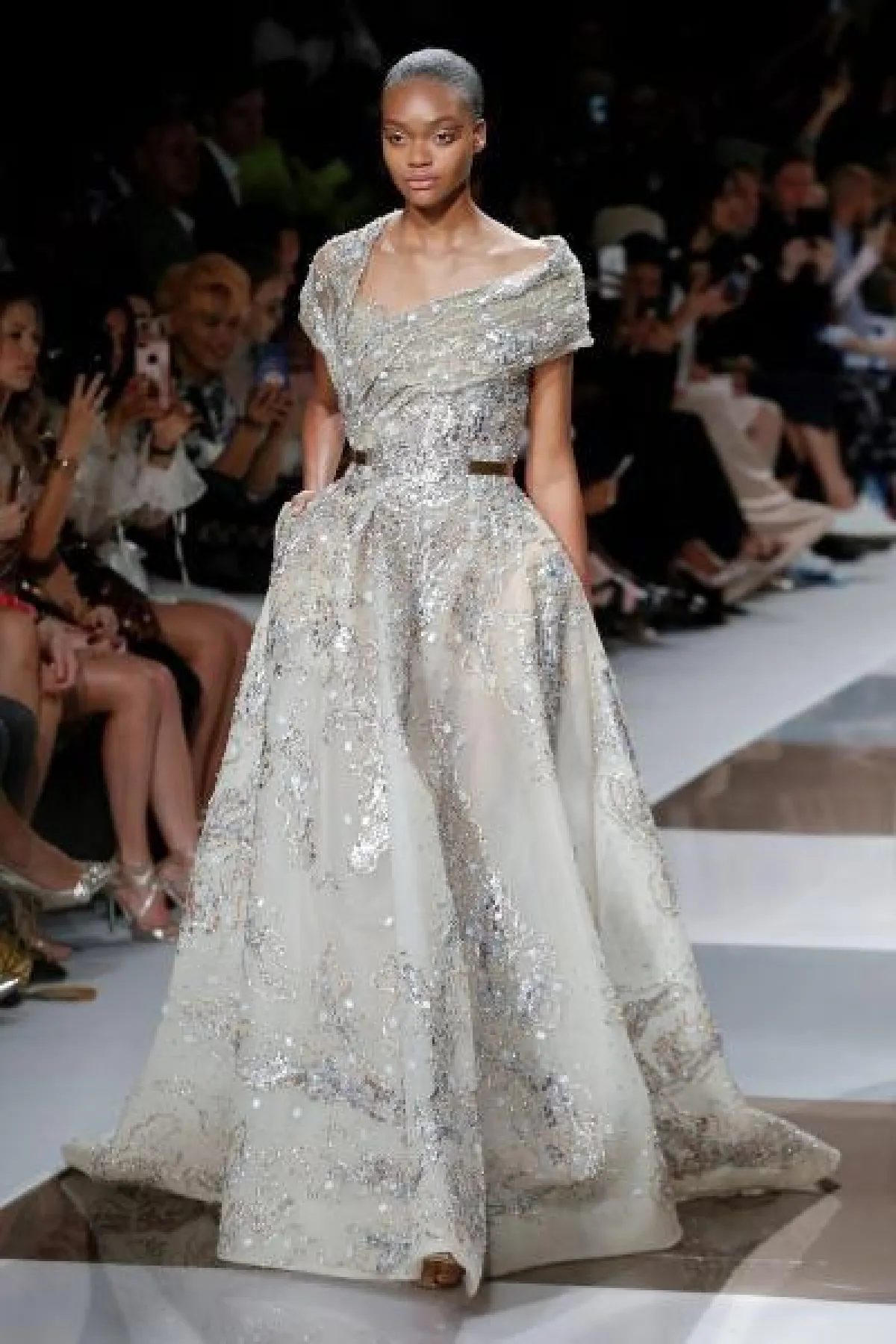 وظهرت الفساتين الكاشفة للأكتاف في عرض ايلي صعب للمسة مفعمة بالأنوثة، بالإضافة للفساتين بالكم الواحد، والمزينة بلمعان يخطف الأنفاس.