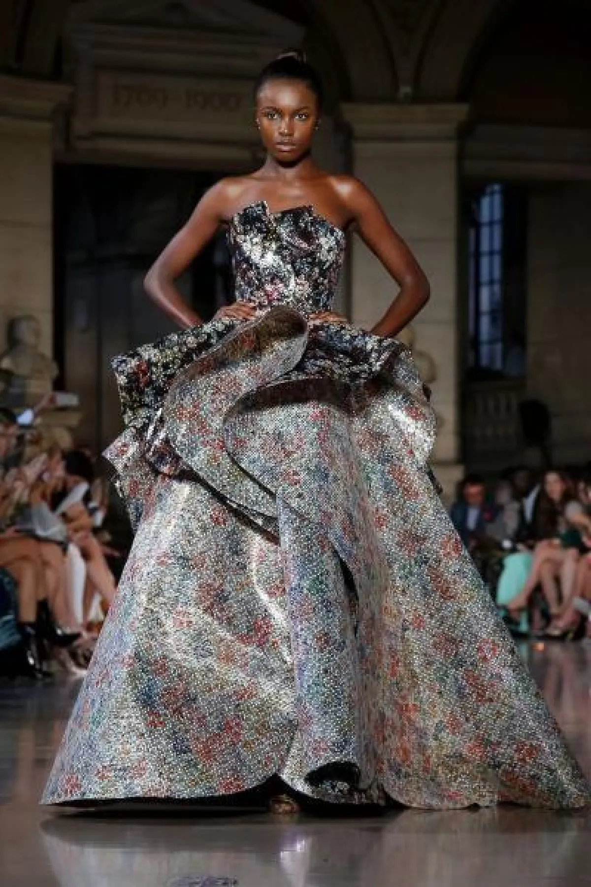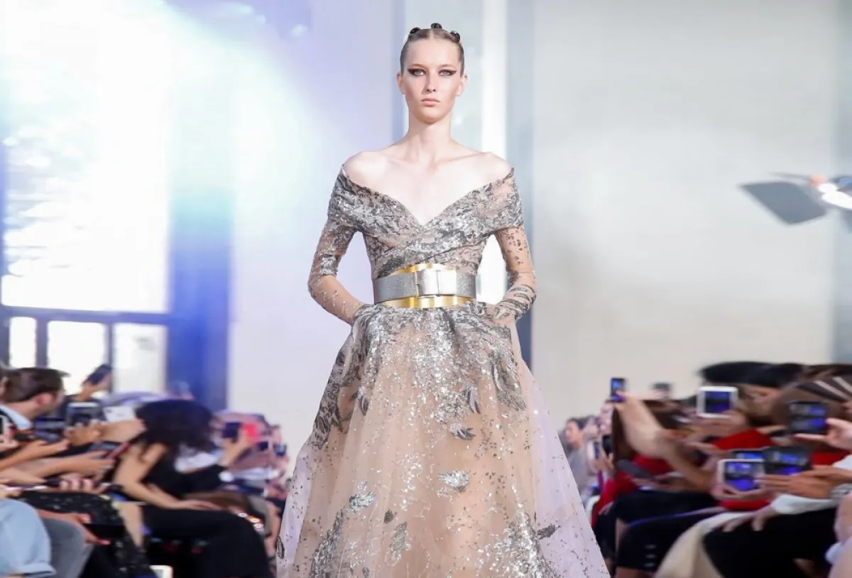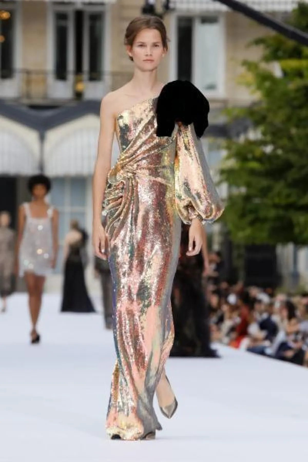 وظهرت الفساتين الكاشفة للأكتاف في عرض ايلي صعب للمسة مفعمة بالأنوثة، بالإضافة للفساتين بالكم الواحد، والمزينة بلمعان يخطف الأنفاس.