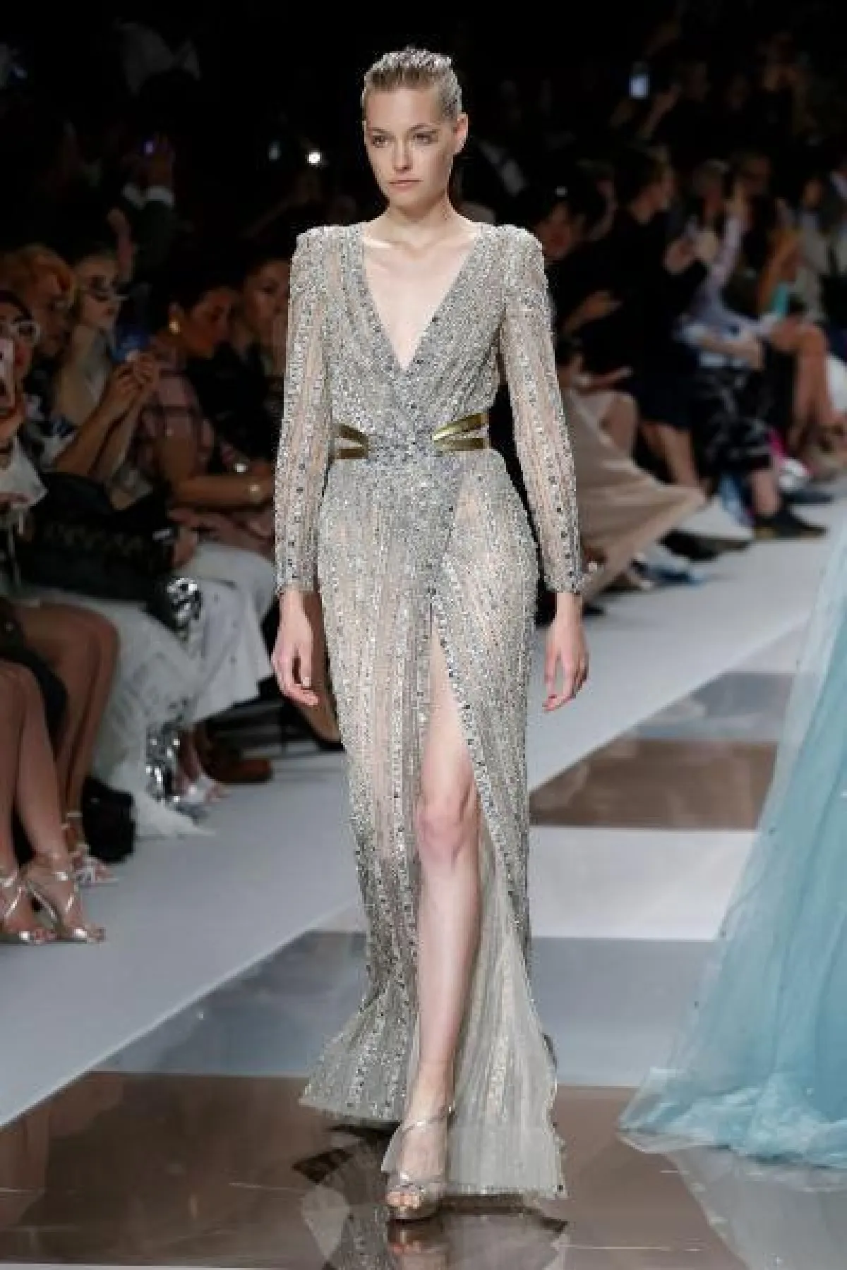 برز اللون الفضي في فساتين ايلي صعب 2020، حيث تزينت بطبعات وتطريزات لامعة على الأقمشة الشفافة.