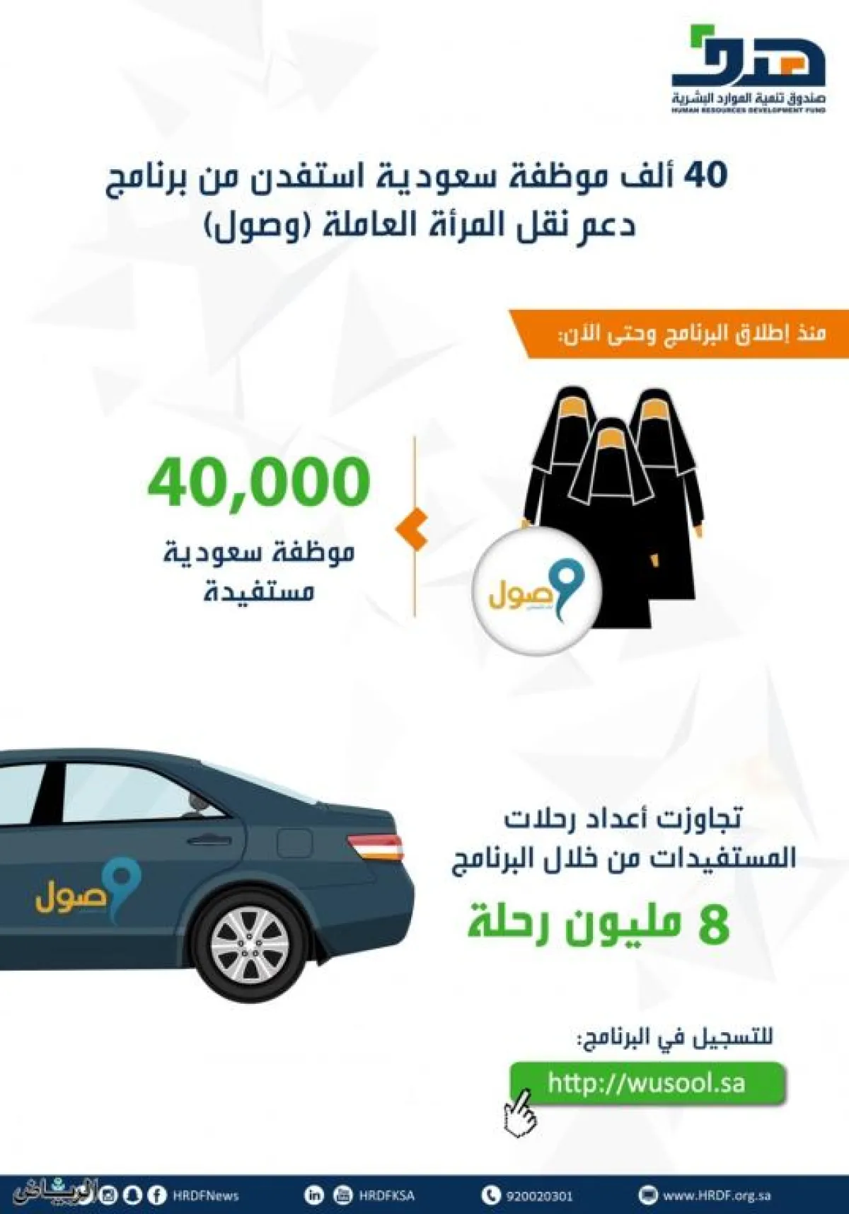 أوضح صندوق تنمية الموارد البشرية (هدف)، أن 40 ألف موظفة سعودية استفدنَ حتى الآن من برنامج دعم نقل المرأة العاملة «وصول»، الهادف إلى تمكين المرأة العاملة في القطاع الخاص، ورفع نسبة مشاركتها في سوق العمل، ودعم استقرارها الوظيفي، بينما تجاوزت أعداد رحلات المستفيدات من خلال البرنامج 8 مليون رحلة.