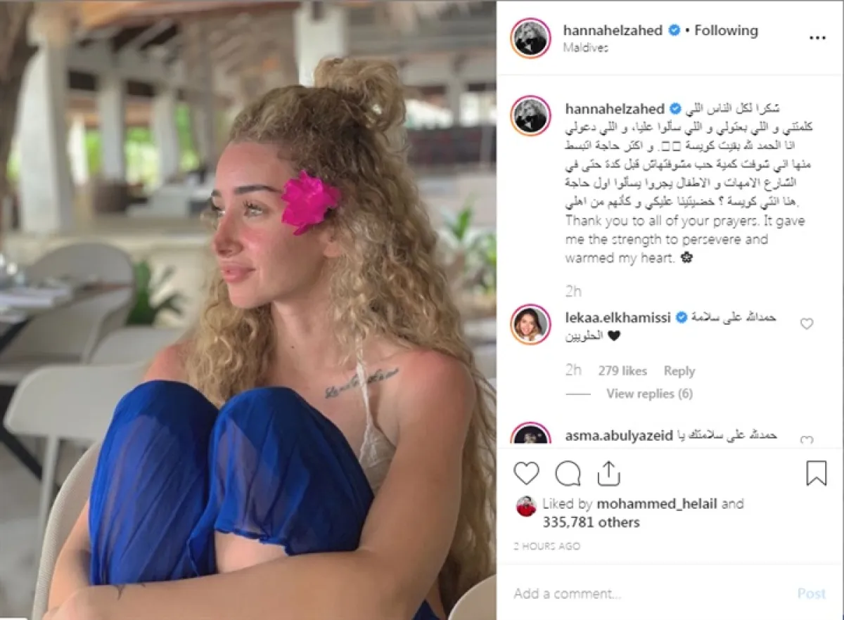 الفنانة هنا الزاهد، وجهت فور وصولها جزر المالديف رسالة شكر عبر حسابها الشخصي على موقع إنستقرام، لكل داعميها خلال فترة مرضها، ونشرت هنا صورة جديدة لها من إجازتها في جزر المالديف، وعلقت عليها قائلة: شكرا لكل الناس اللي كلمتني واللي بعتولي واللي سألوا عليا، واللي دعولي أنا الحمد لله بقيت كويسة، وأكتر حاجة اتبسطت منها أني شوفت كمية حب مشوفتهاش قبل كدة حتى في الشارع، الأمهات والأطفال يجروا يسألوا أول حاجة هنا أنتي كويسة؟ خضيتينا عليكي وكأنهم من أهلي.