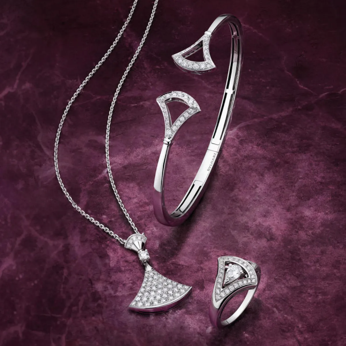 تضمّ المجموعة الجديدة قلادات تتدلى كل منها بسلسلة من العقيق (الكارنليان) أو عرق اللؤلؤ مزينة بماس مرصوف، إضافة لأقراط وأساور متماثلة. وكل جوهرة من مجوهرات المجموعة تتلألأ متوهجة بالبريق الذي أشتهرت به بولغري بلا منازع.