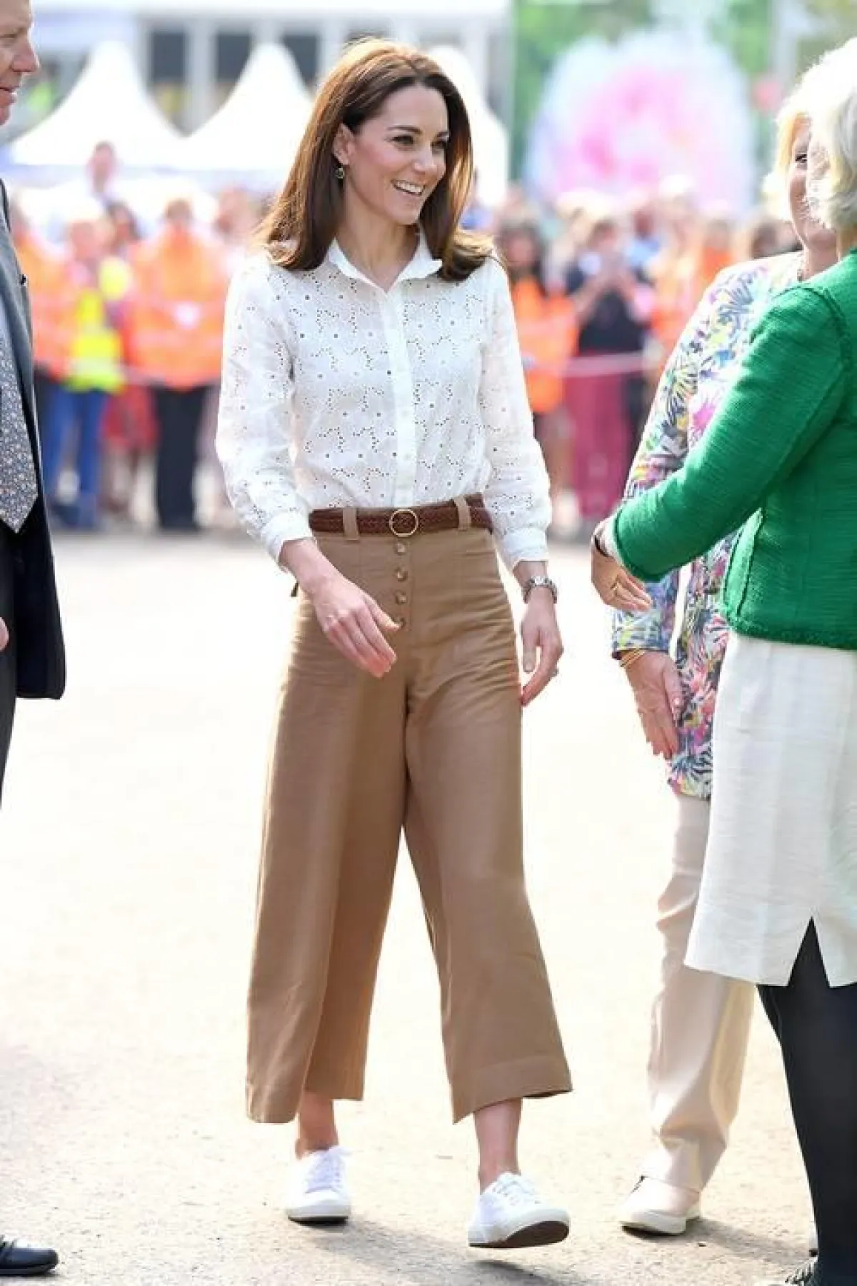 اعتمدت دوقة كامبريدج، كيت ميدلتون، زوج من الأحذية الرياضية البيضاء بتصميم ناعم، و نسقتها مع بنطلون واسع بستايل الـ كولوتيس الرائج. يمكنكِ اعتماد ستايل "ميدلتون" هذا الخريف مع إضافة كنزة صوف تحميكِ من نسمات الخريف الباردة.